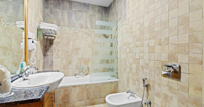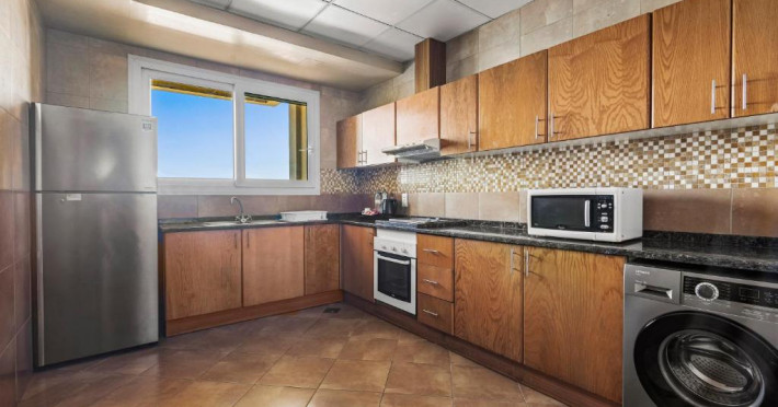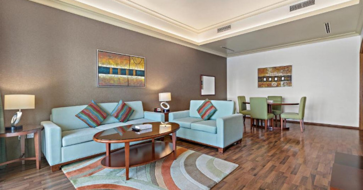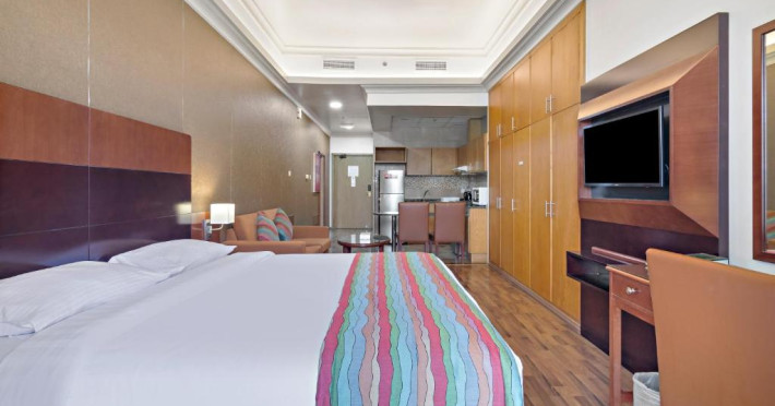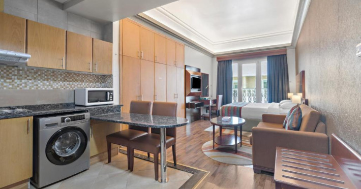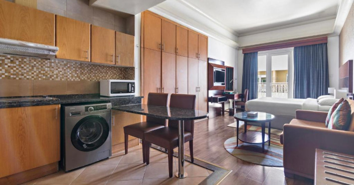 Fiecare suită de la Al Khoory Hotel Apartments Al Barsha include o baie de designer și facilități moderne de bucătărie.