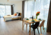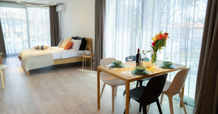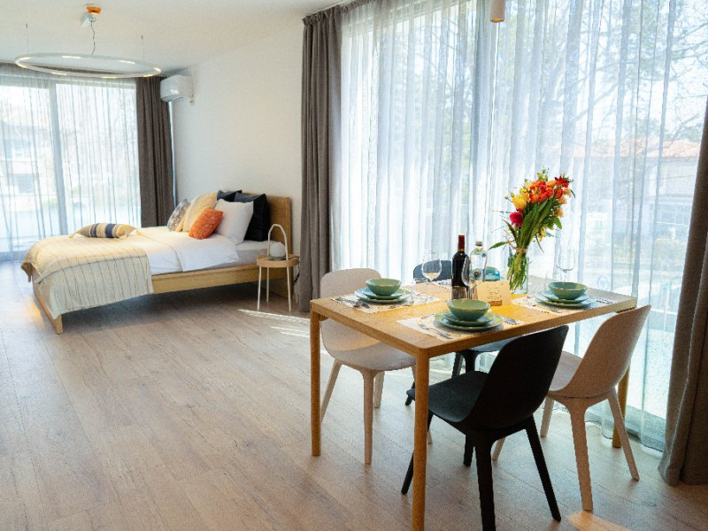 Studio Superior  - estemai spatios si este format dintr-un spatiu deschis cu bucatarie utilata, patmatrimonial (160200), fotoliu extensibil, baie cu dus, balcon cu mobilier. Are1 loc de parcare asigurat. Suprafata: 49 mp + balcon 7 mp.