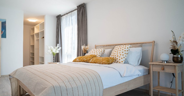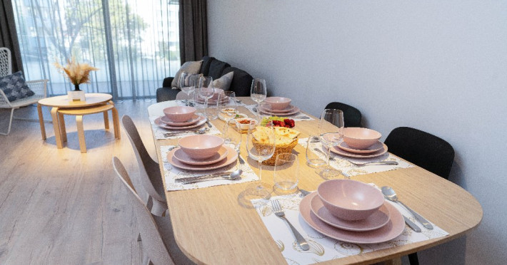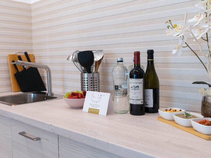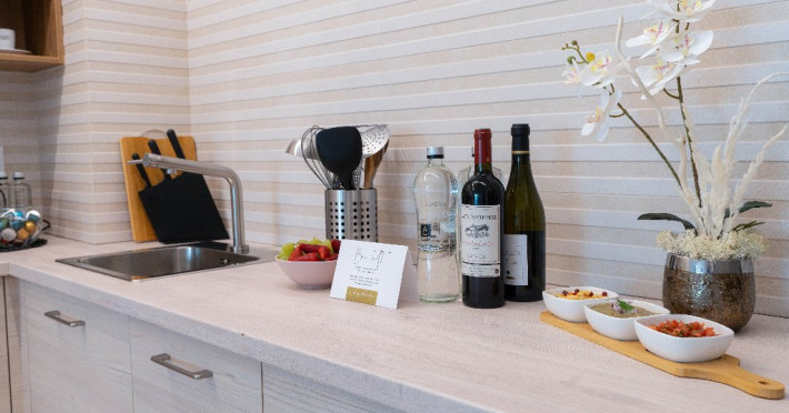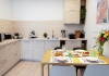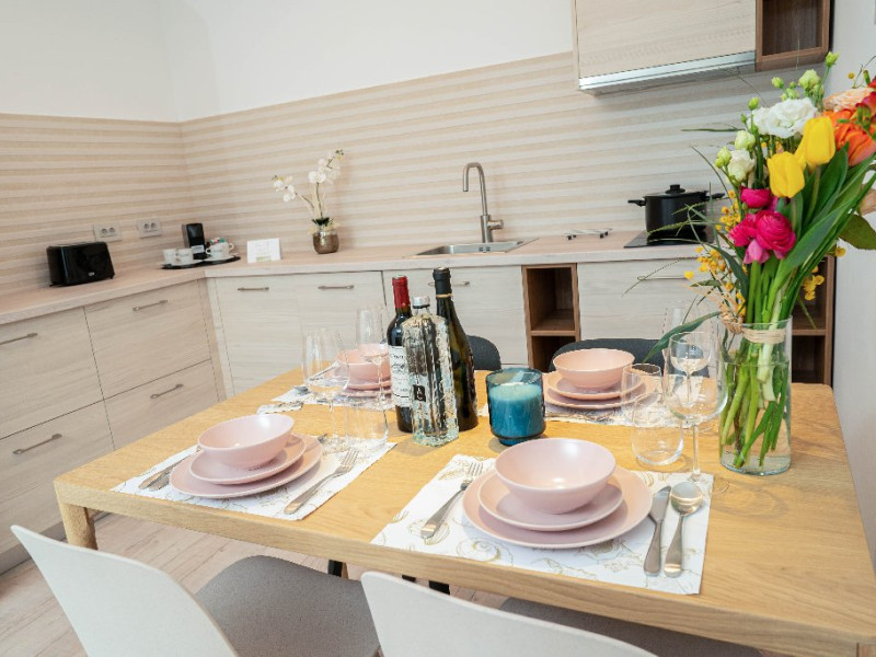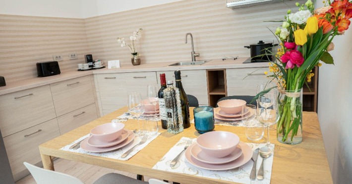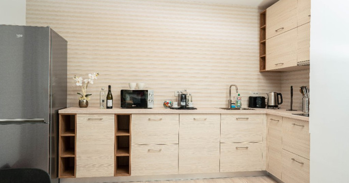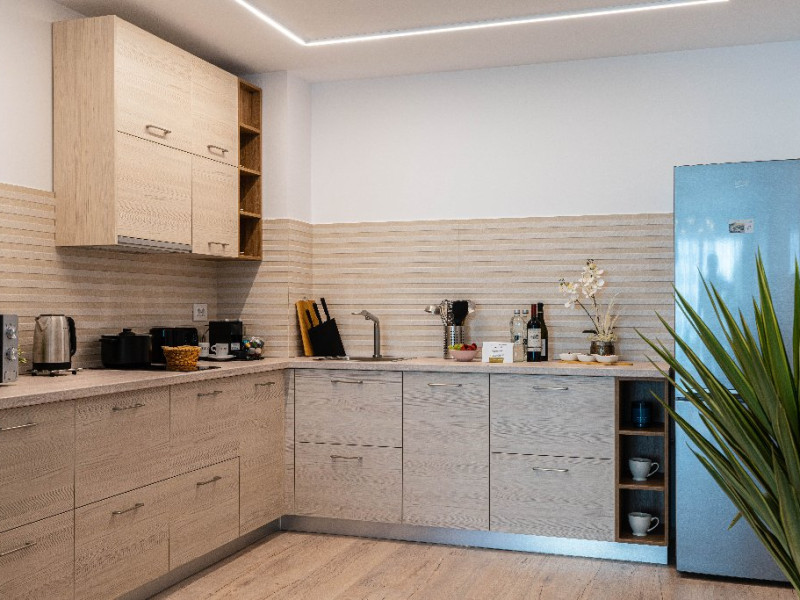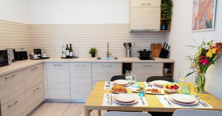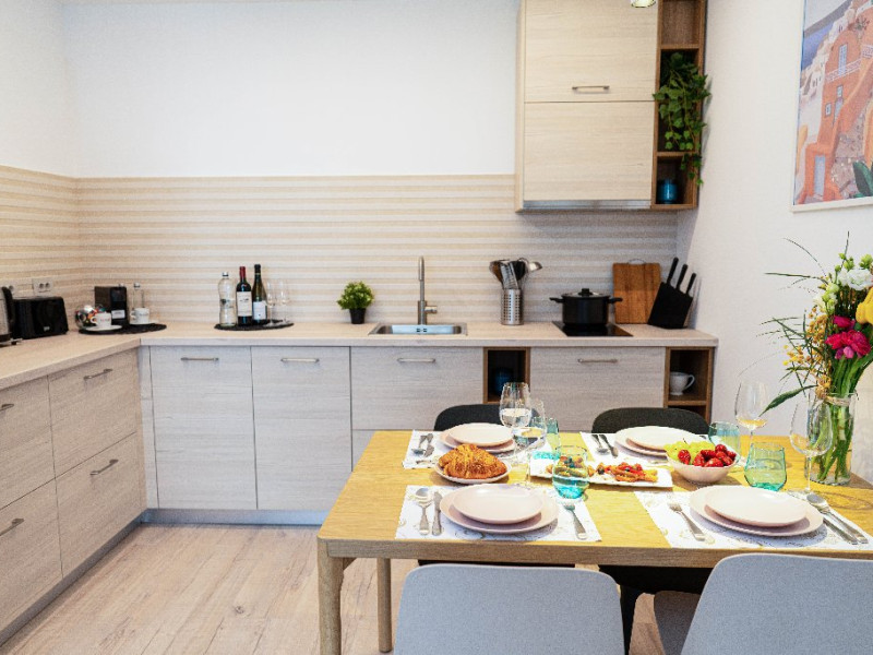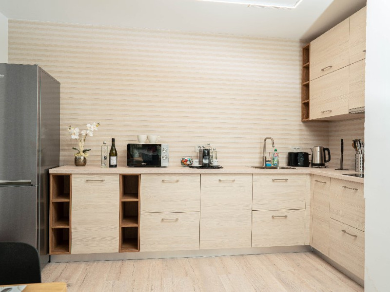 Bucatariile sunt utilate cu masina de spalat vase, plita cu inductie, cuptor cu microunde,vesela, ustensile pentru gatit, masa cu scaune, frigider, espressor, prajitor de paine, fierbator apa.
