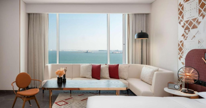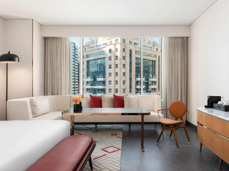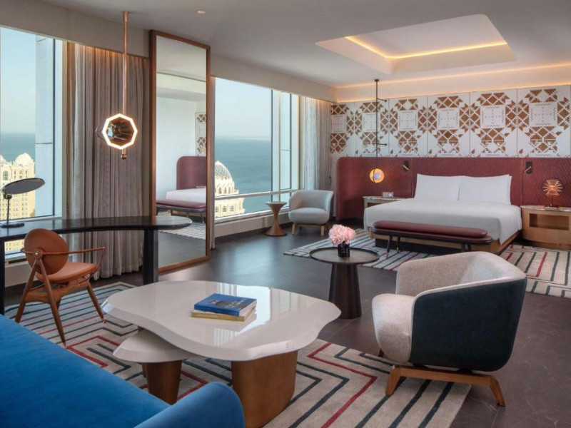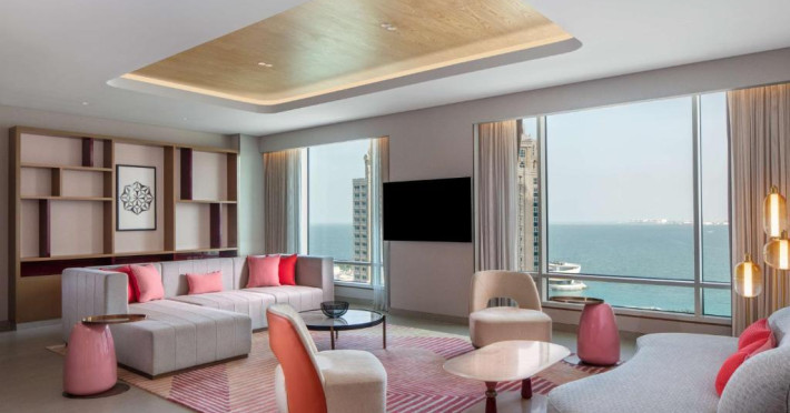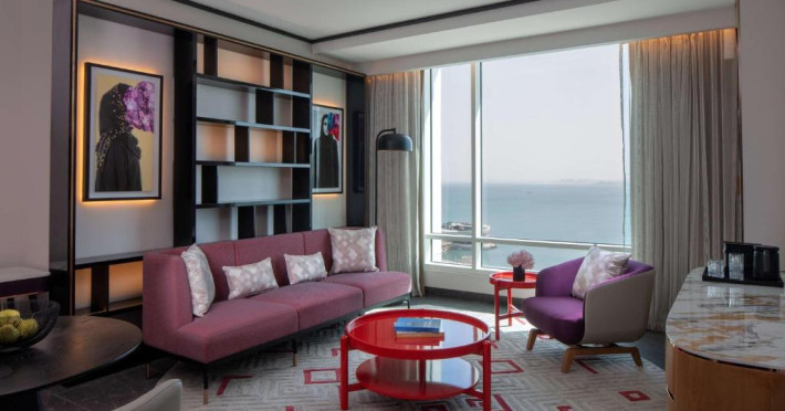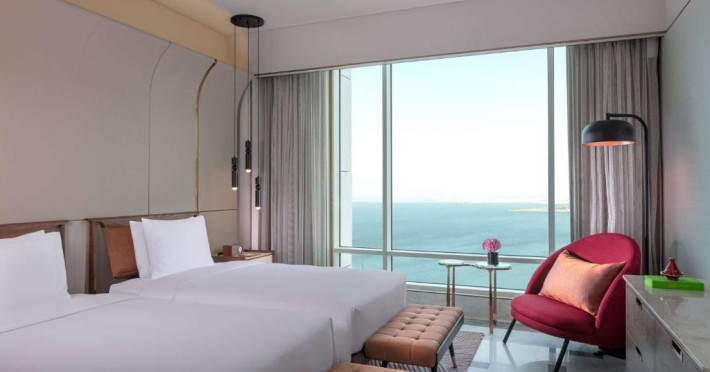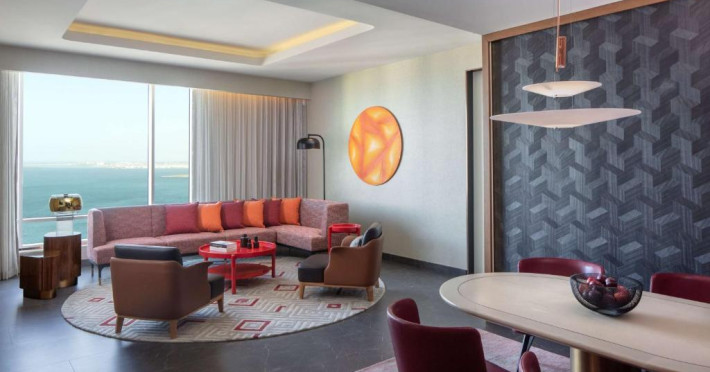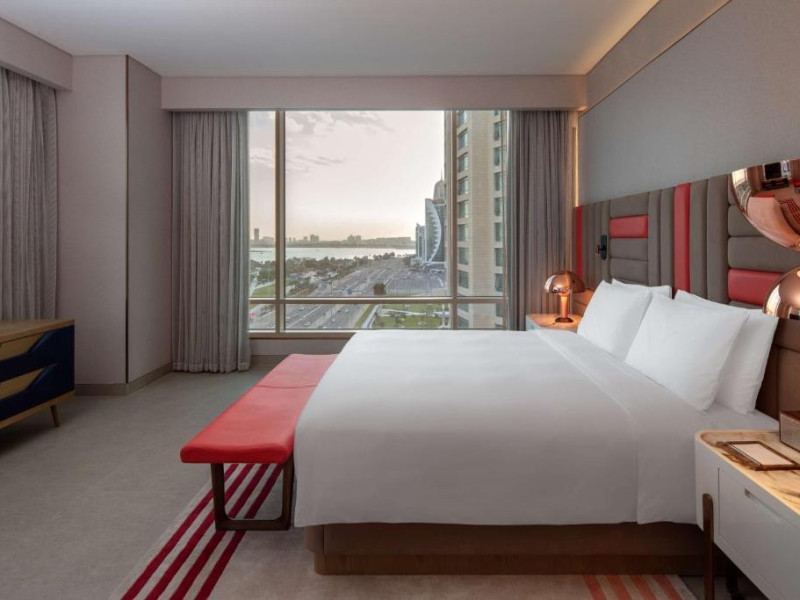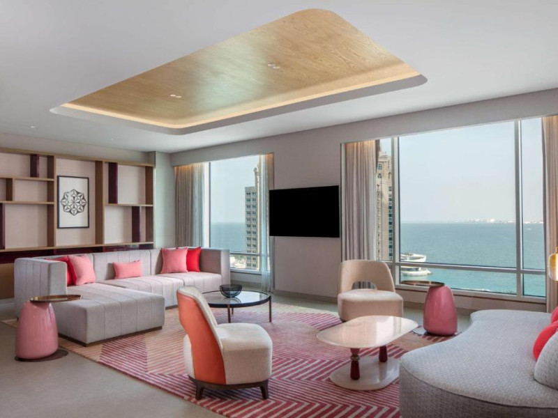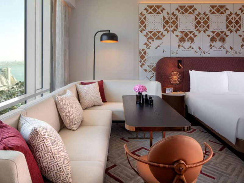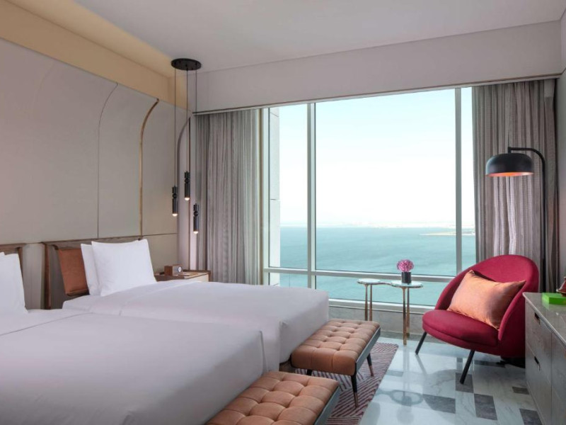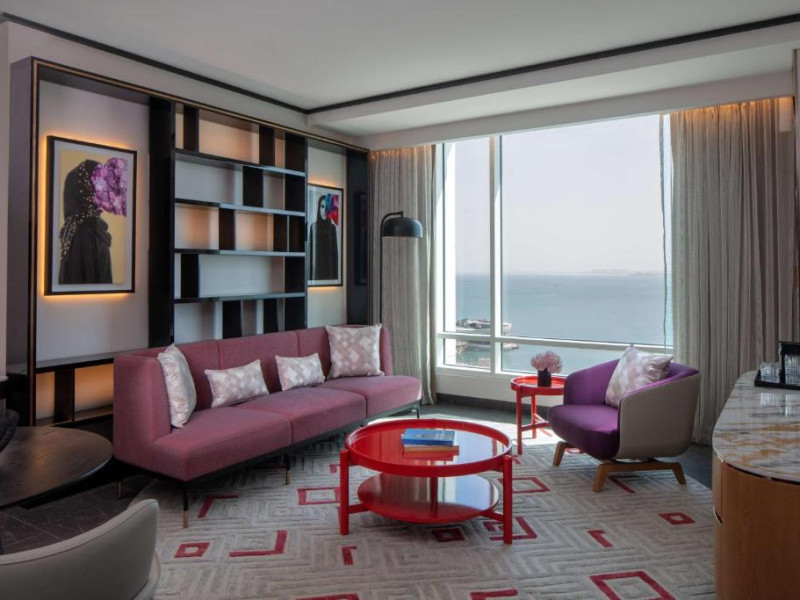 Designul contemporan al hotelului imbină elegant elementele culturale locale cu luxul modern. Camerele și suitele spațioase impresionează prin decorațiunile rafinate și priveliștile panoramice asupra orașului și Golfului Persic.
