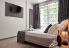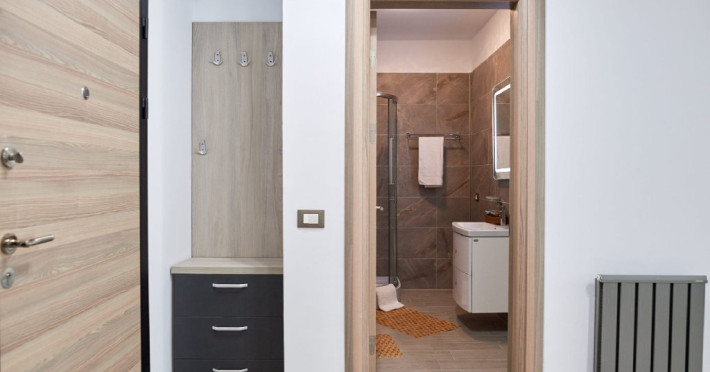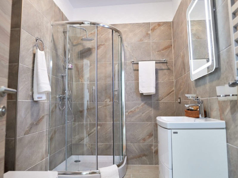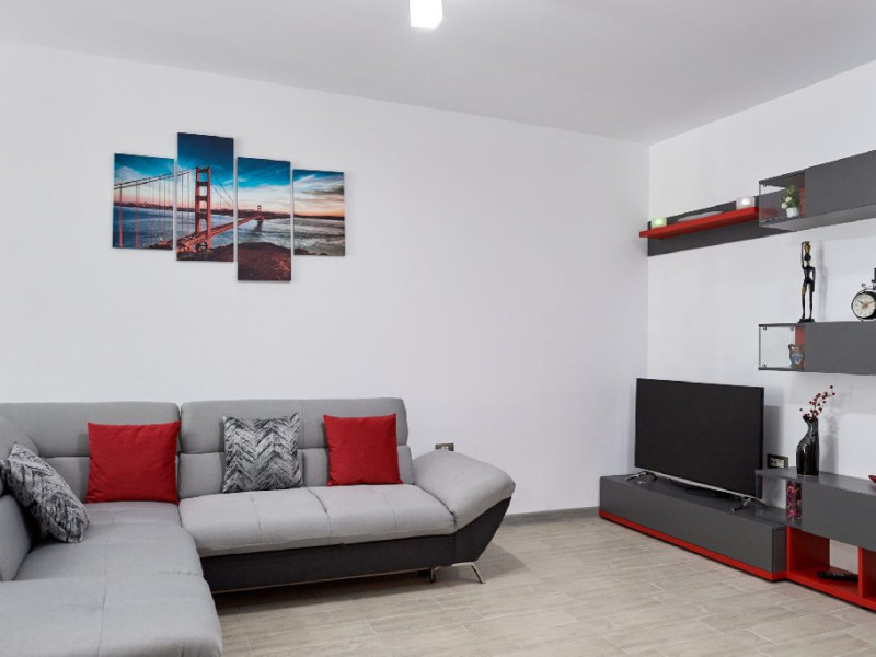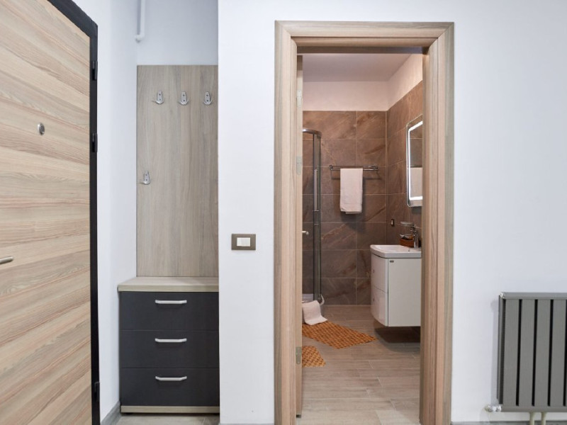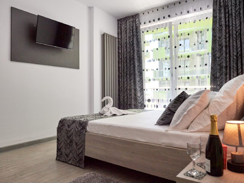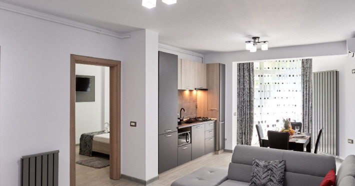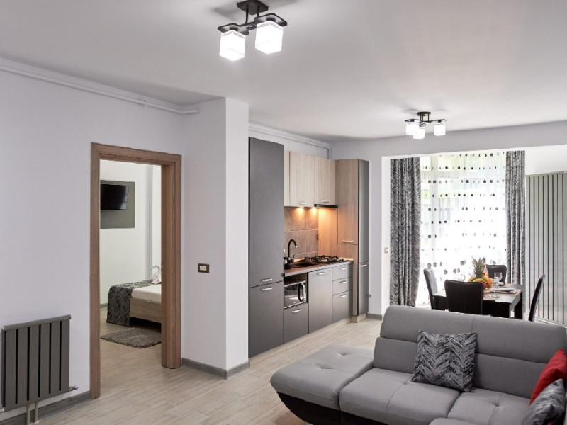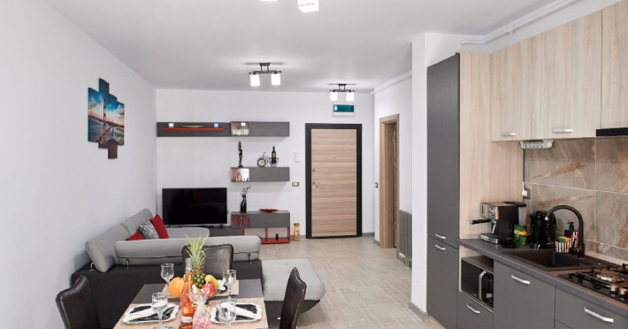 Apartamentul este complet mobilat si utilat modern, oferind un dormitor cu pat matrimonial si un living cu canapea extensibila. Pentru confortul dumneavoastra, apartamentul dispune de aer conditionat si conexiune Wi-Fi gratuita. Bucataria este complet utilata, iar baia are o cabina de dus. Pentru momentele de relaxare, puteti folosi mobilierul de pe terasa si scaunul pentru copii, asigurand astfel un sejur placut si confortabil pentru toti oaspetii.