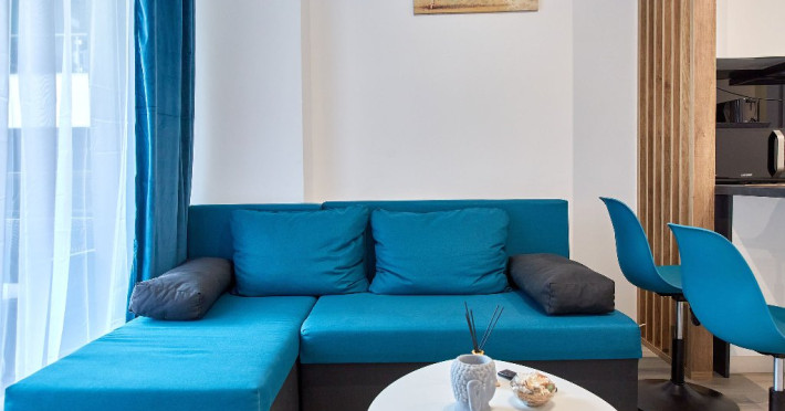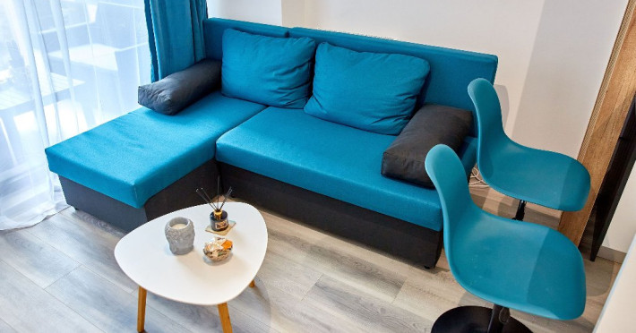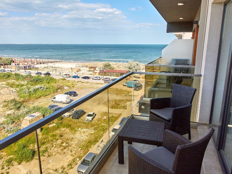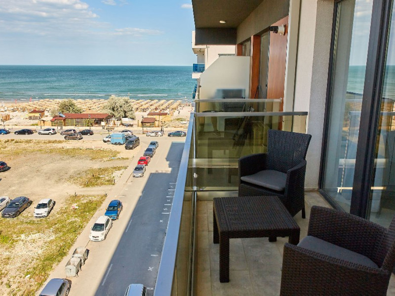 Fiind compus din doua camere, acces din fiecare pe terasa - cu vederea spre mare, apartamentul ofera capacitate de gazduire pentru 4 persoane, avand un pat matrimonial in dormitor si o canapea extensibila in living.