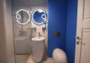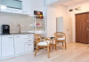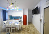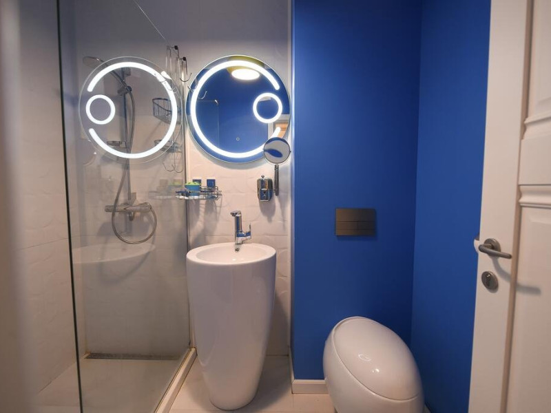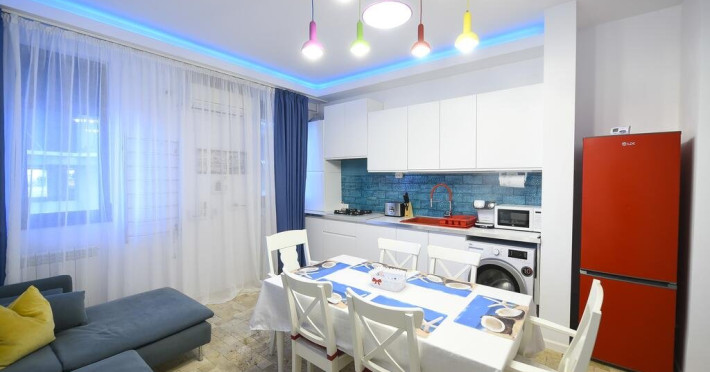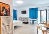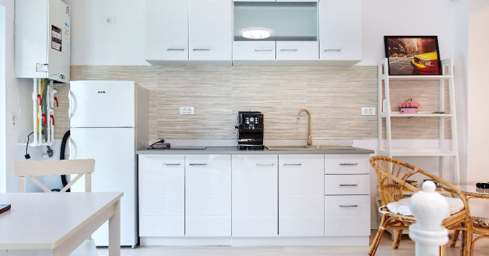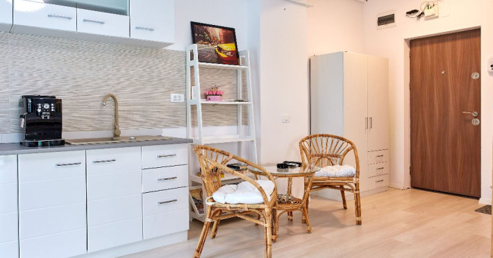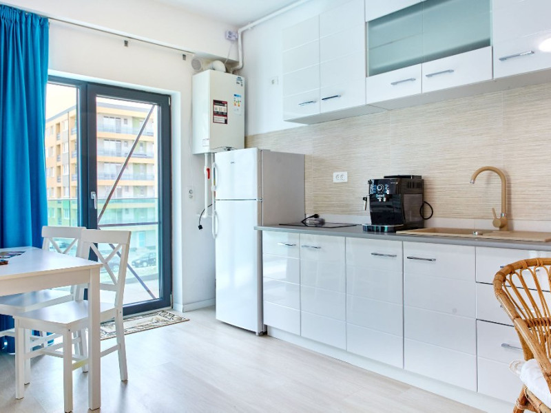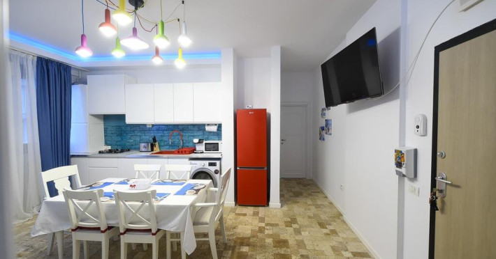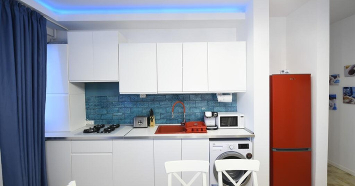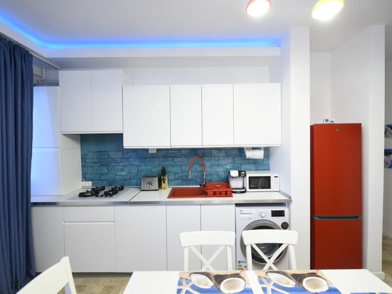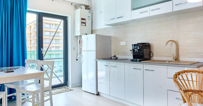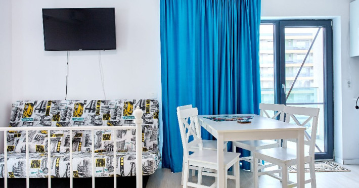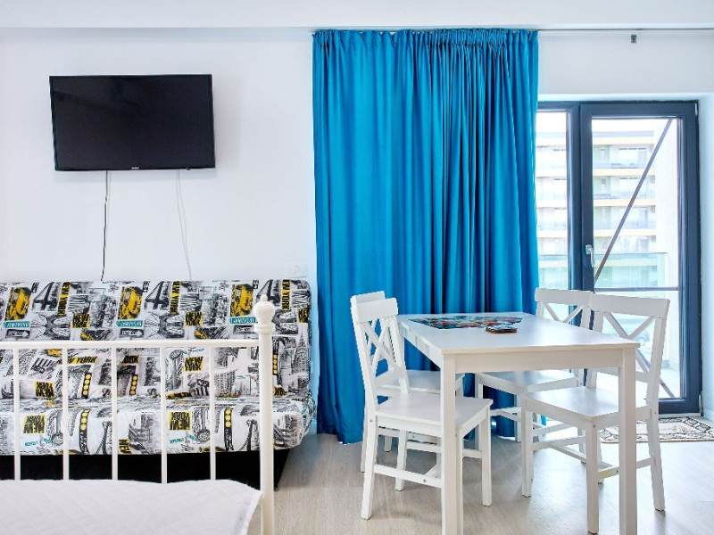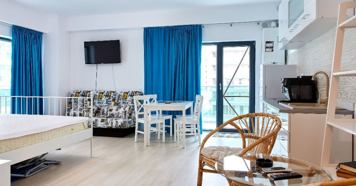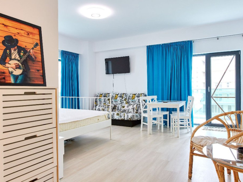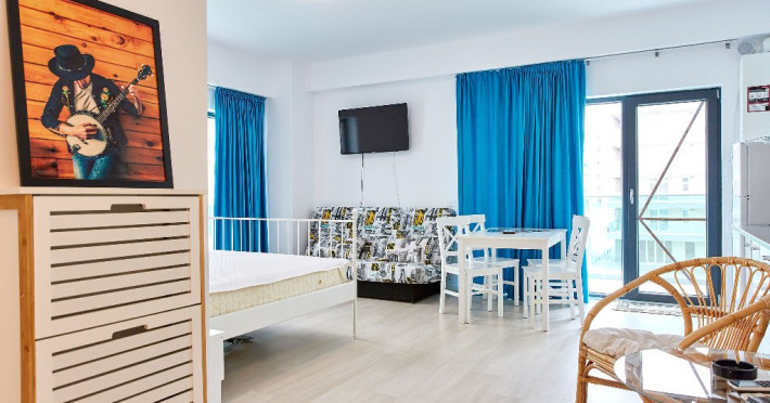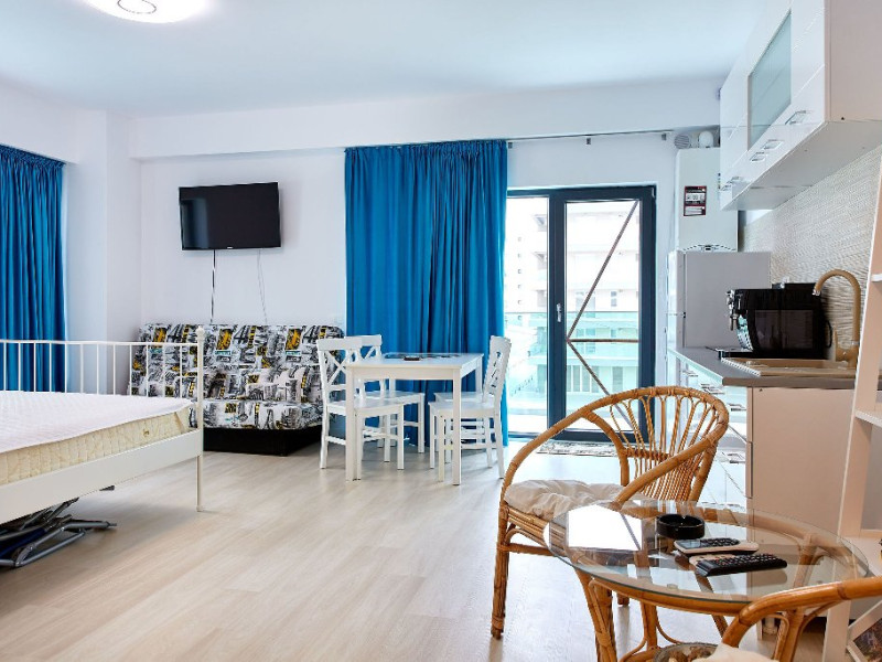 Studio Rif este situat la malul marii, intr-o pozitie care imbina faleza cu marea, in cea mai cautata statiune turistica de pe litoralul romanesc, Mamaia Nord. Studio-ul este ideal atat pentru o familie cu un copil, dar si pentru un grup de tineri pusi pe distractie, deoarece cluburile sunt la o mica distanta de proprietate, astfel ca distractia va fi si ea prezenta la cote maxime. Studio-ul Rif ofera un ambient contemporan, cu accente de confort si eleganta. Zona de dormit este dominata de un pat matrimonial amplasat strategic pentru a maximiza spatiul si confortul. Lenjeria de pat de inalta calitate imbraca salteaua, asigurand o odihna linistita si reconfortanta. Vizavi de pat, o canapea extensibila ofera spatiu suplimentar pentru relaxare sau cazare a oaspetilor extra. Un televizor modern este montat pe perete, perfect pentru serile de film sau pentru urmarirea stirilor dimineata. In zona de bucatarie, mobila alba, lustruita, completeaza armonios aparatura moderna si dotarile necesare pentru prepararea meselor. O masa cu scaune albe invita la conversatii si mese intr-un cadru intim, in timp ce draperiile albastre adauga un strop de culoare si intimitate incaperii. Baia se prezinta intr-o paleta monocroma de alb, de la faianta pana la mobilier, creand o atmosfera de curatenie si spatiu. Cabina de dus este spatioasa si usor de utilizat, asigurand o experienta placuta si functionala. Oglinda si lavoarul sunt incorporate intr-un ansamblu care ofera si spatiu de stocare pentru produsele de igiena personala. Balconul accesibil din studio este un colt de rai, unde oaspetii se pot destinde, bucurandu-se de aerul proaspat si de momente de liniste. Dotari Suplimentare: