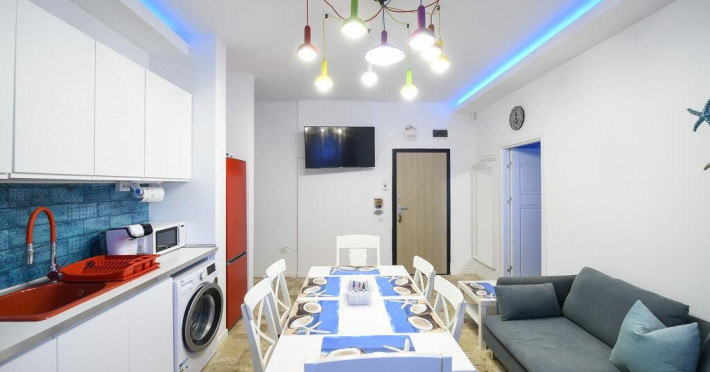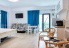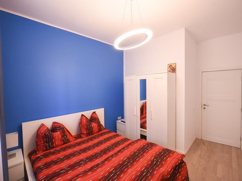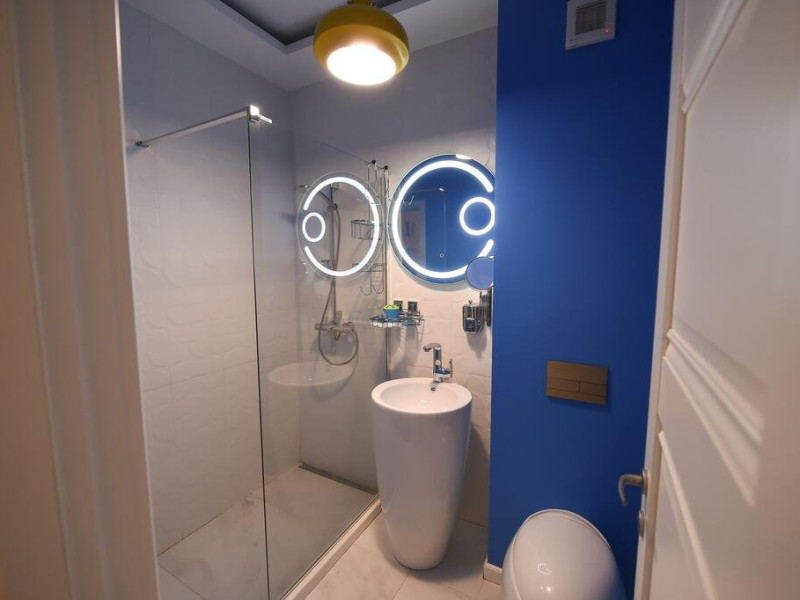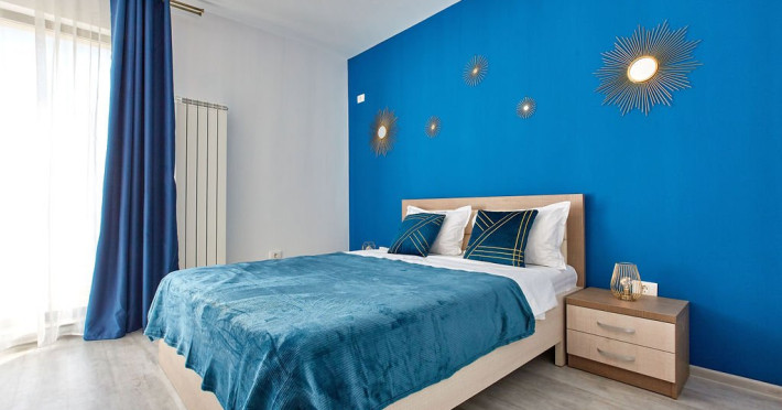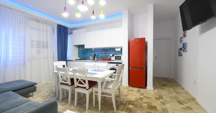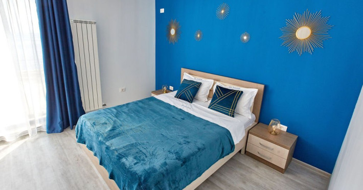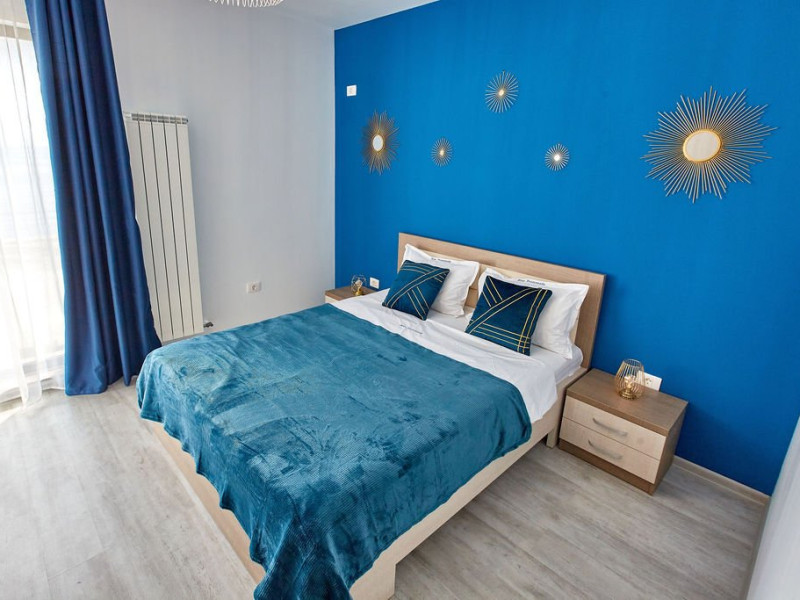 Apartamentul Blue Promenada se remarca prin designul sau sofisticat si detaliile de lux, fiind un spatiu care imbina confortul cu eleganta si frumusetea peisajului marin. Sufrageria este inima apartamentului, un spatiu generos si luminos. Canapeaua extensibila gri, accesorizata cu perne in tonuri de verde si alb, invita la relaxare si momente de liniste. Doua fotolii gri completeaza zona de sedere, oferind un loc suplimentar de odihna. Masa neagra din sticla adauga un contrast puternic, in timp ce draperiile in nuanta de verde smarald amplifica atmosfera luxoasa a camerei. Detaliile de decor sunt alese cu grija, adaugand o nota de rafinament. Televizorul montat pe perete ofera divertisment, iar fereastra mare deschide privirea catre marea infinita, transformand sufrageria intr-un loc magic. Bucataria este un spatiu separat, functional si elegant. Masa cu scaune ofera locul ideal pentru servirea meselor, in timp ce mobila din lemn deschis la culoare adauga o nota de caldura si naturalete. Toate dotarile sunt moderne, promitand o experienta culinara de neuitat. Aceasta este dotata cu aragaz, cuptor cu microunde , aparat de cafea , frigider. Dormitorul este un sanctuar al linistii si confortului. Culorile dominante sunt nuantele de albastru, care inspira calm si serenitate. Patul matrimonial, cu lenjerie in tonuri de albastru, este flancat de un perete albastru cu decoratiuni aurii, care adauga un plus de eleganta. Draperiile albastre amplifica atmosfera de odihna, iar mobila din lemn deschis completeaza designul camerei. Televizorul si dulapul generos sunt esentiale pentru functionalitate, iar fereastra ofera o priveliste superba asupra marii. Baia este un spatiu modern, dotat cu o cabina de dus spatioasa si o masina de spalat de ultima generatie, promitand confort si eficienta. Balconul este punctul de atractie al apartamentului, oferind o vedere frontala la marea azurie. Mobilierul este perfect pentru relaxare, fie ca doresti sa savurezi o bautura sau sa te pierzi in contemplarea peisajului. Dotari Suplimentare: