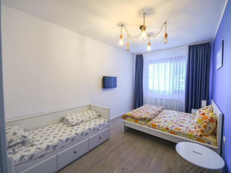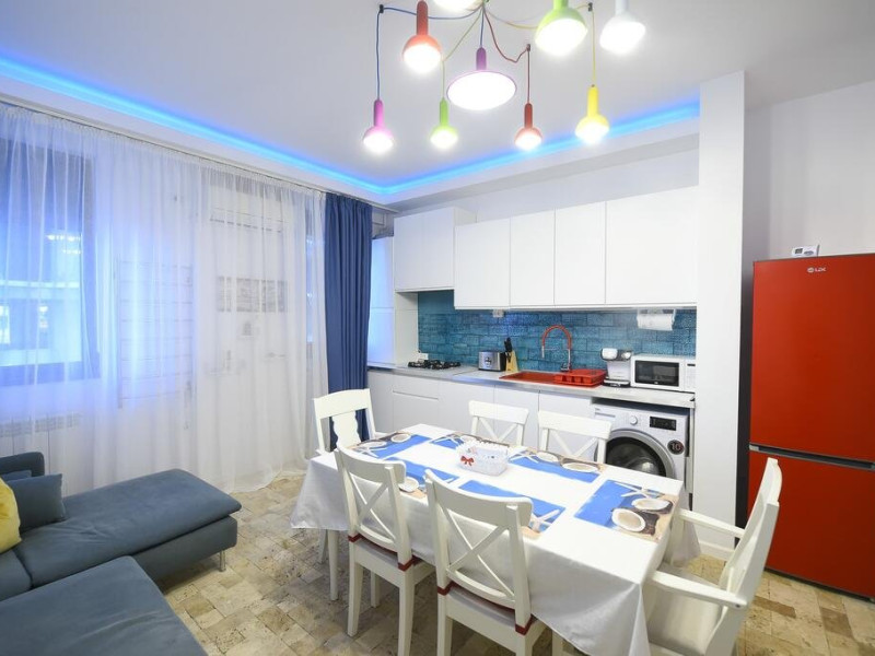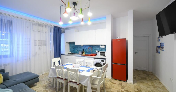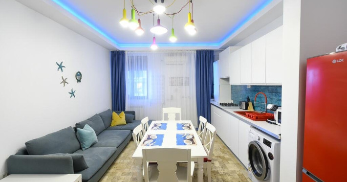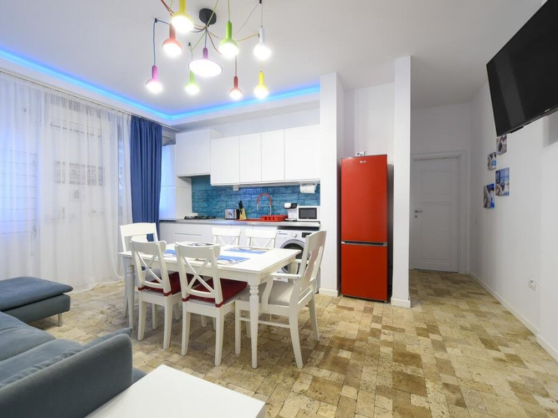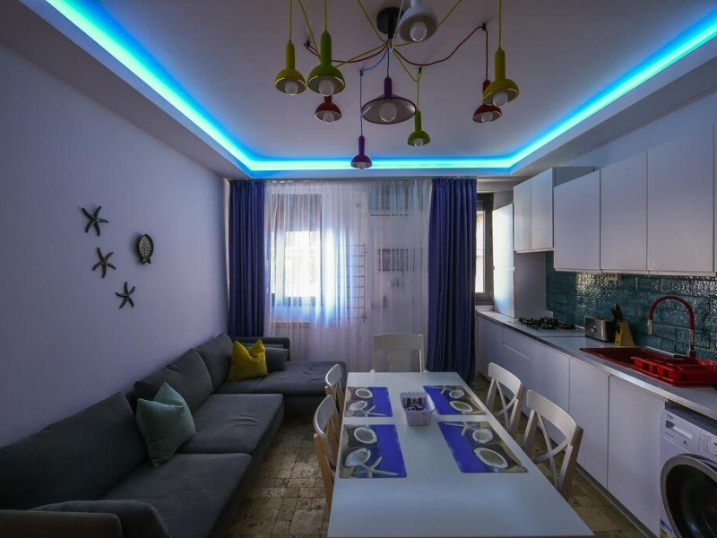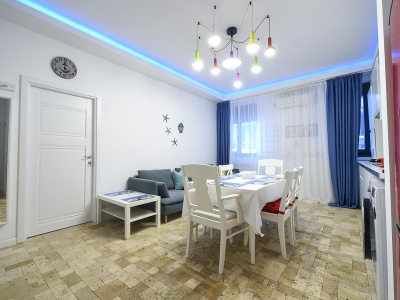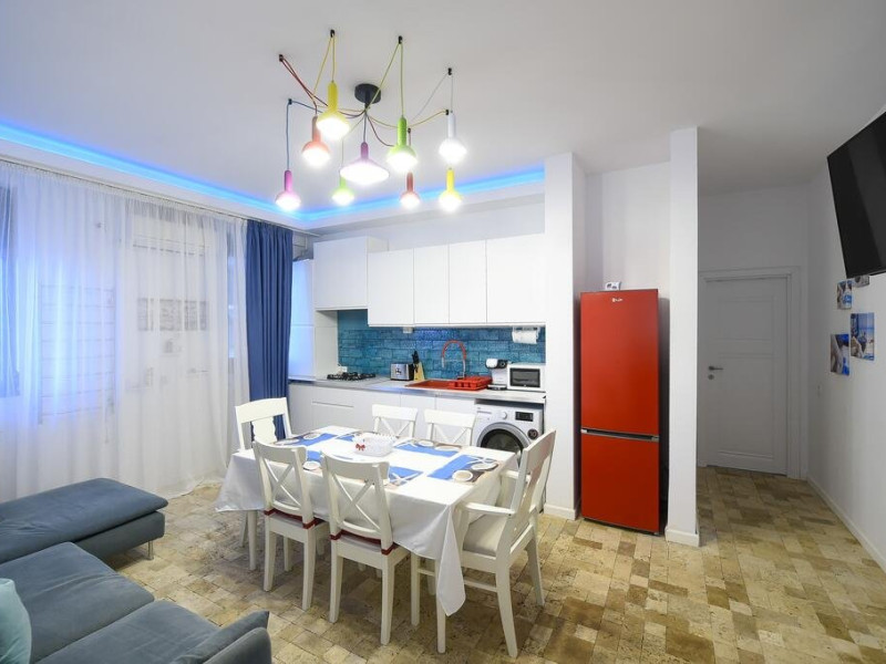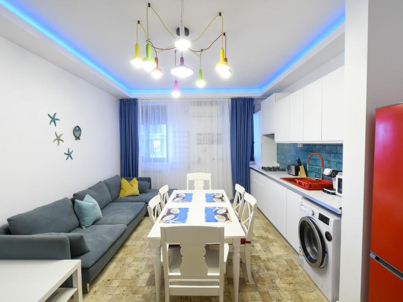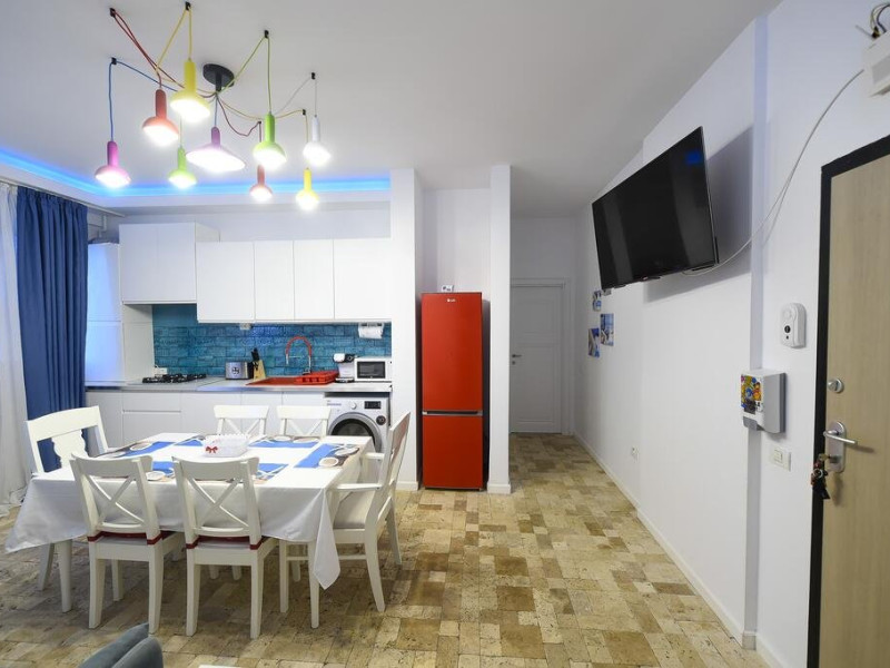 Va punem la dispozitie un apartament superb, modern si spatios. Apartamentul Mystic Promenada se afla intr-un bloc nou construit, cu materiale de calitate si cu finisaje premium atent alese pentru a spori confortul turistilor. Apartamentul Mystic se afla in Mamaia Nord, la malul marii,astfel ca din acest motiv este foarte atractiv in ochii turistilor. Sufragerie: Apartamentul Mystic Promenada impresioneaza de la intrare cu o sufragerie open space, proiectata pentru a satisface gusturile celor mai rafinati oaspeti. Punctul central este reprezentat de canapeaua extensibila, confortabila si estetic placuta. In fata acesteia, un mobilier alb modern sustine un televizor de ultima generatie, perfect pentru serile de relaxare. In fundal, o masa de servit mesele invita la momente placute petrecute alaturi de cei dragi. Bucatarie: Bucataria din apartamentul Mystic Promenada este o combinatie de functionalitate si stil. Echipata complet, aceasta dispune de toate electrocasnicele necesare pentru prepararea meselor, inclusiv o masina de spalat moderne. Fiecare element de design si fiecare piesa de mobilier au fost gandite astfel incat sa optimizeze spatiul si sa ofere confortul dorit. Dormitor: Dormitorul este un sanctuar al linistii si confortului. Patul matrimonial, cu design modern, promite nopti odihnitoare. Mobilierul negru adauga o nota de eleganta si rafinament incaperii. Functionalitatea nu a fost neglijata, avand in vedere dressingul spatios si televizorul montat strategic pentru vizionare din pat. Baie: Baia apartamentului este un exemplu de stil si eficienta. Finisajele de calitate, combinate cu o cada generoasa, invita la momente de relaxare. Designul modern se completeaza armonios cu detaliile practice, rezultand o incapere functionala si placuta din punct de vedere estetic. Curte exterioara: Fiind plasat la parter, apartamentul Mystic Promenada are privilegiul unei iesiri directe catre o curte exterioara. Acest spatiu verde, delimitat discret, ofera o oaza de liniste si relaxare, fiind perfect pentru a savura o cafea dimineata sau pentru a te bucura de aer proaspat in serile calde. Dotari Suplimentare: Sistem de climatizare modern (aer conditionat) Conexiune Wi-Fi de mare viteza. Televizor in dormitorul principal si sufragerie cu o gama variata de posturi