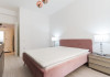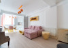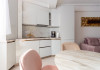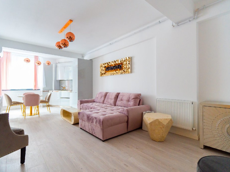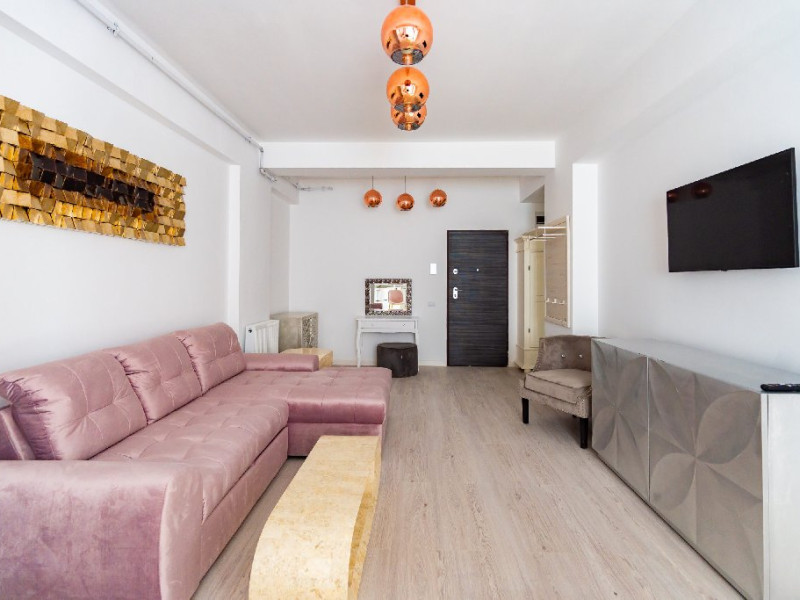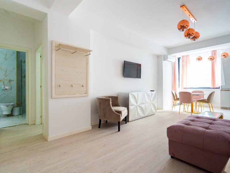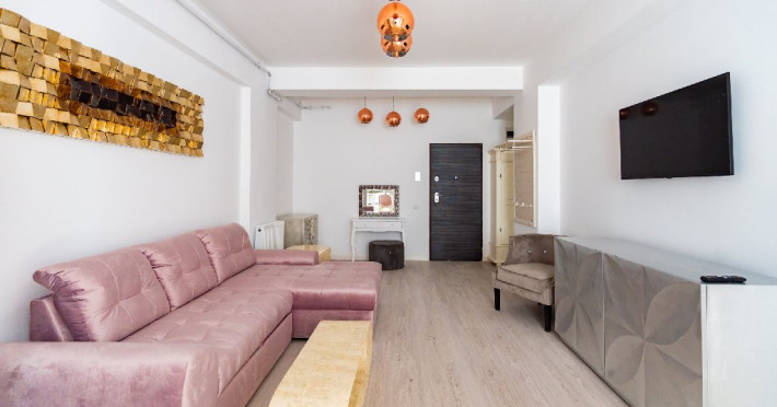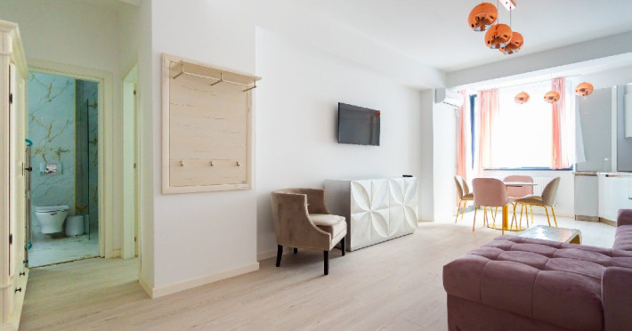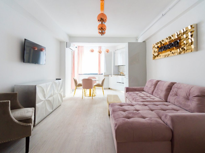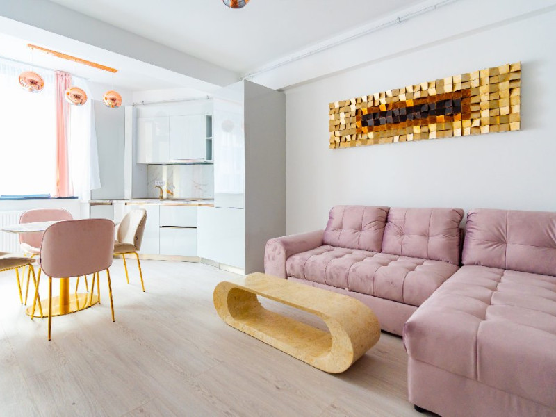 Bucatarie: Bucataria, aflata in aceeasi zona open-space cu sufrageria, este echipata cu mobilier alb, elegant, ce ofera un contrast placut cu rozul canapelei.Aceasta este doata cu o plita electrica moderna , aparat de cafea , frigider incorporat.Langa zona de gatit, o masa alba si scaune moderne in tonuri de roz pal asteapta sa gazduiasca mesele in familie sau cu prietenii.