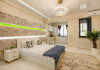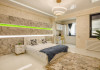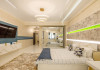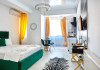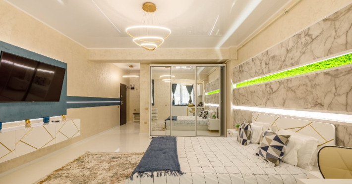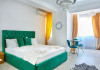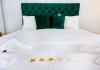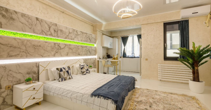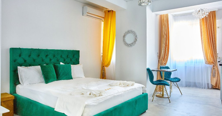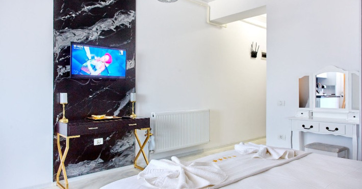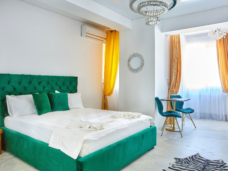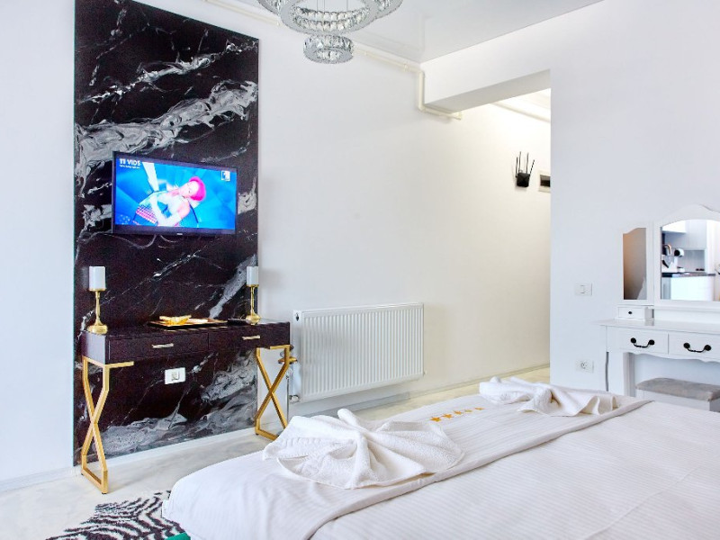 Centrul acestei incaperi este patul matrimonial, care, cu o lenjerie de calitate si culoarea verde smarald, te invita la odihna si la visare. Este un loc care imbina confortul cu un lux discret, iar alaturi, dulapul generos asigura tot spatiul necesar pentru oaspeti. Elementul surprinzator al dormitorului este bucata de perete cu design stil marmura, care serveste drept fundal pentru un televizor modern, completand astfel spatiul de relaxare. Masa neagra cu picioare aurii si covorul cu model de zebra adauga o nota de excentricitate si stil.