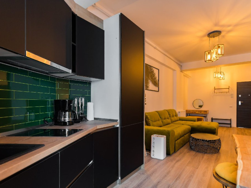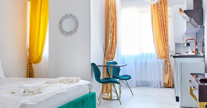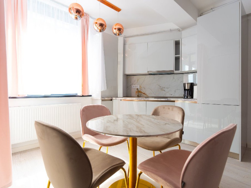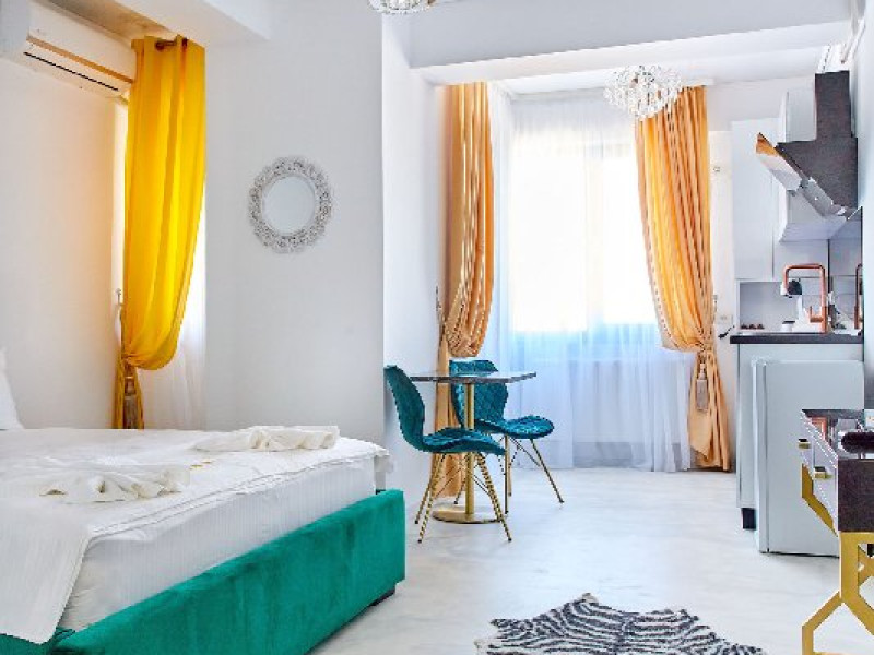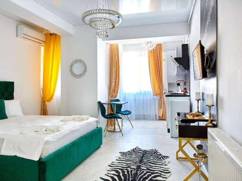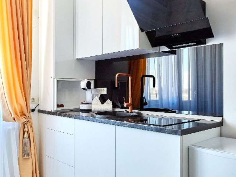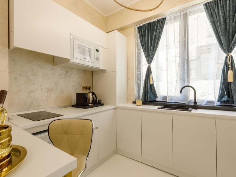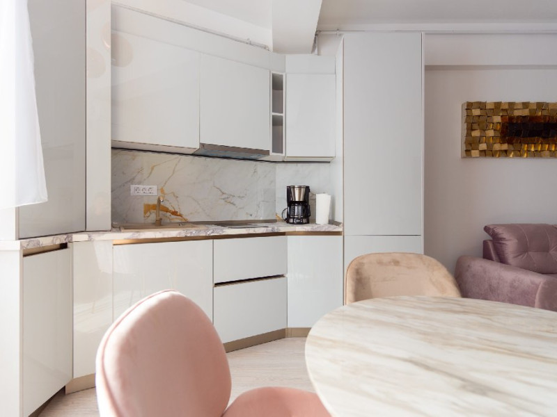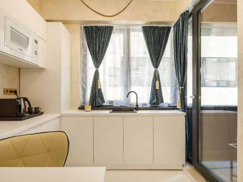 Zona de bucatarie este la fel de impresionanta, cu mobilierul alb curat si blatul care imita marmura, reflectand un gust impecabil si un simt al detaliului. Aceasta este dotata cu plita moderna , hota, aparat de cafea, frigider, vesela. Aici, o masa eleganta, acompaniata de scaune de catifea intr-un ton de verde smarald care rimeaza cu patul, isi asteapta oaspetii sa se bucure de mese intr-o atmosfera selecta. Draperiile galbene adauga un contrast cald si luminos intregii incaperi.