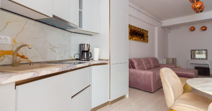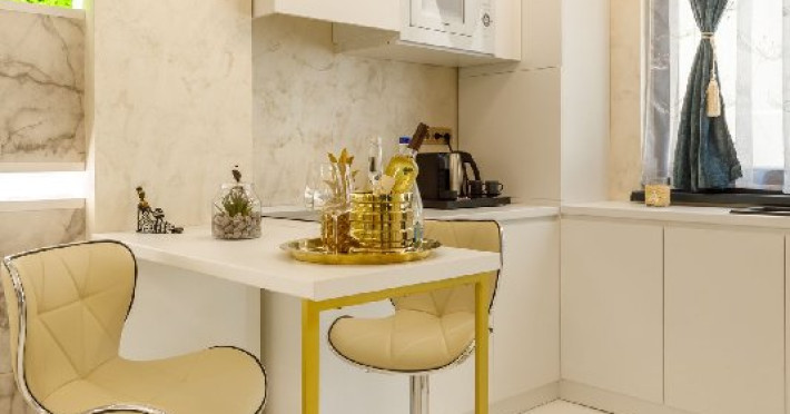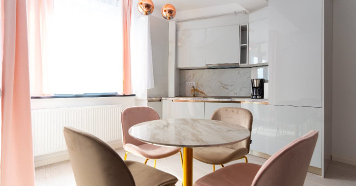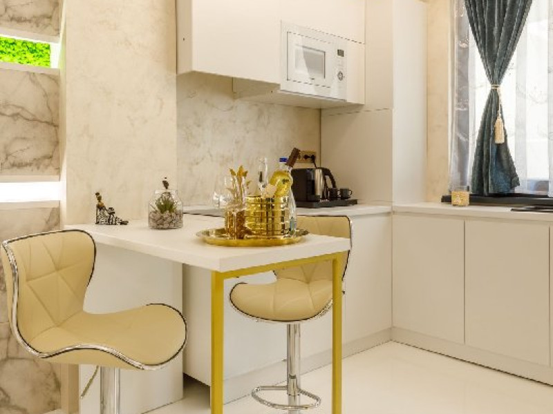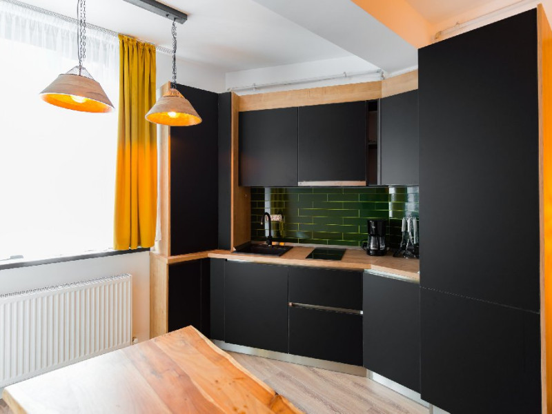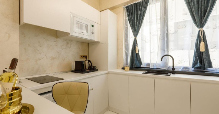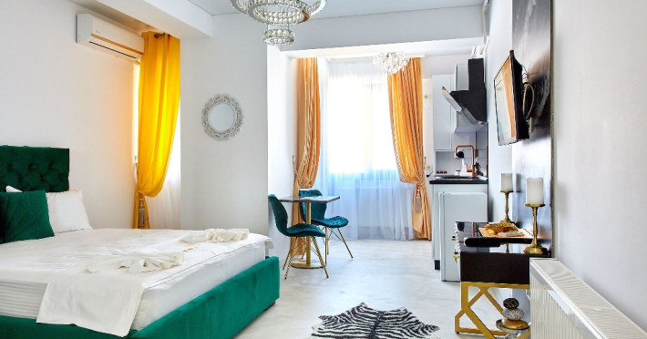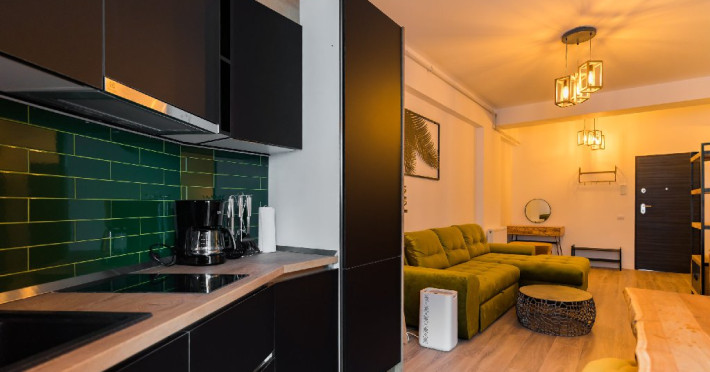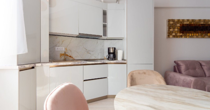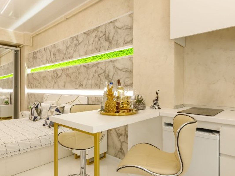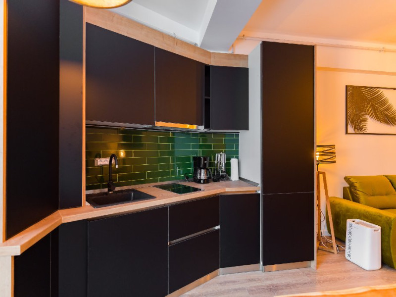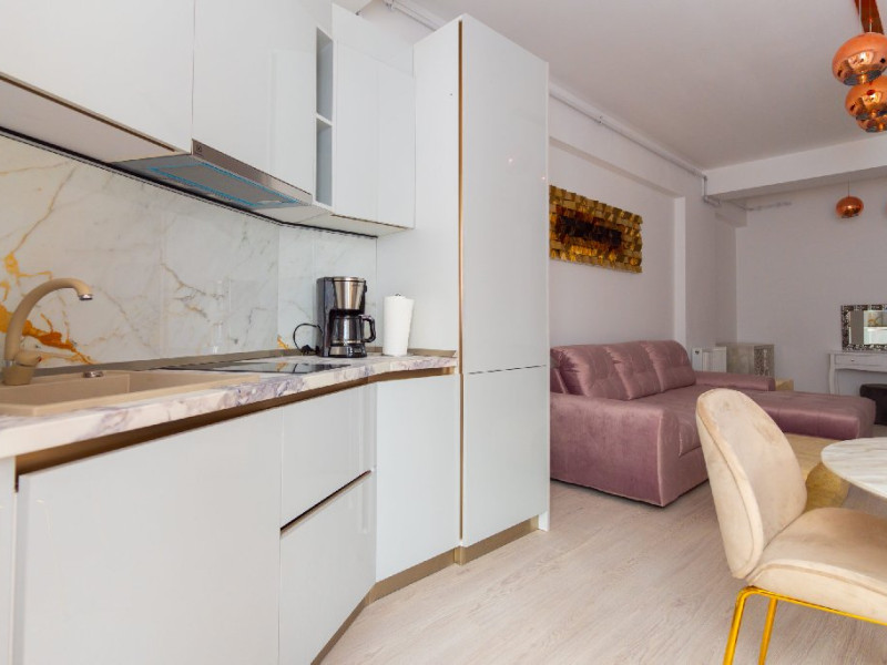 Zona de bucatarie este la fel de impresionanta, cu mobilierul alb curat si blatul care imita marmura, reflectand un gust impecabil si un simt al detaliului. Aceasta este dotata cu plita moderna , hota, aparat de cafea, frigider, vesela. Aici, o masa eleganta, acompaniata de scaune de catifea intr-un ton de verde smarald care rimeaza cu patul, isi asteapta oaspetii sa se bucure de mese intr-o atmosfera selecta. Draperiile galbene adauga un contrast cald si luminos intregii incaperi.