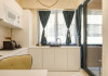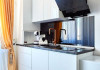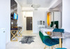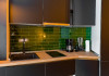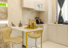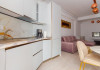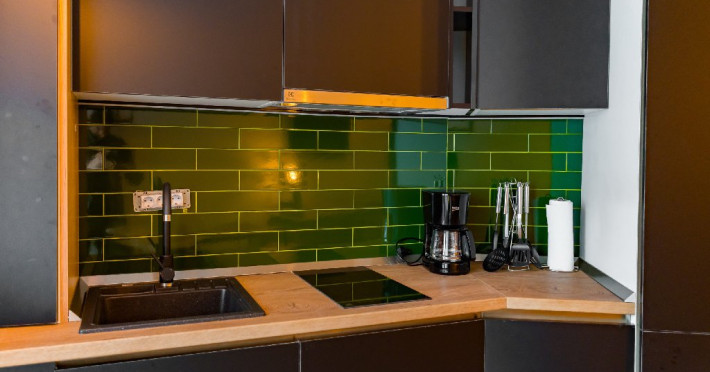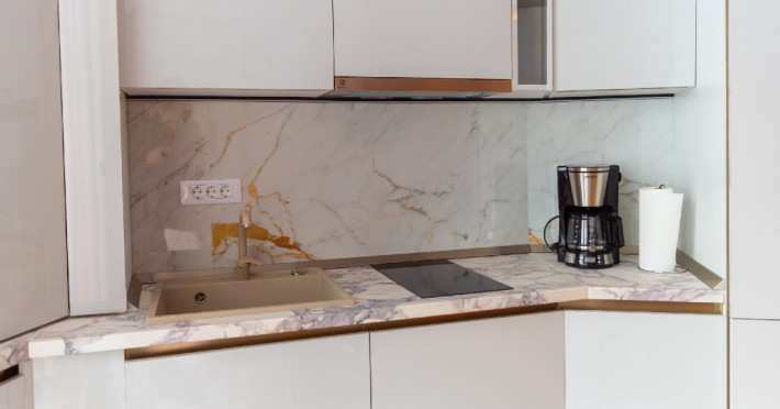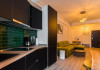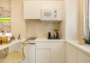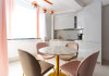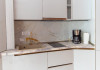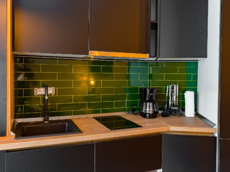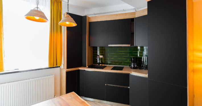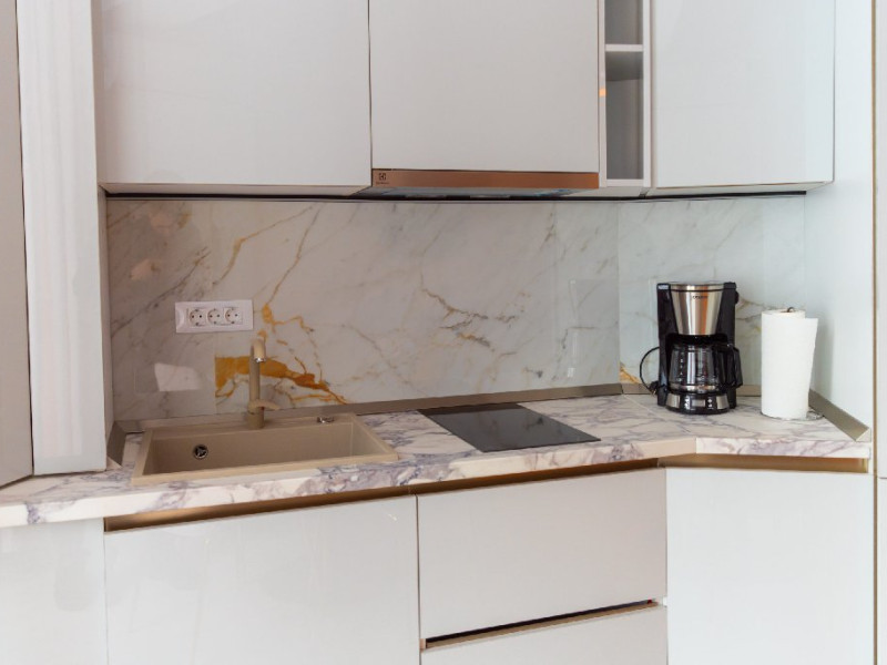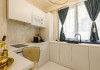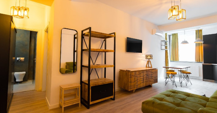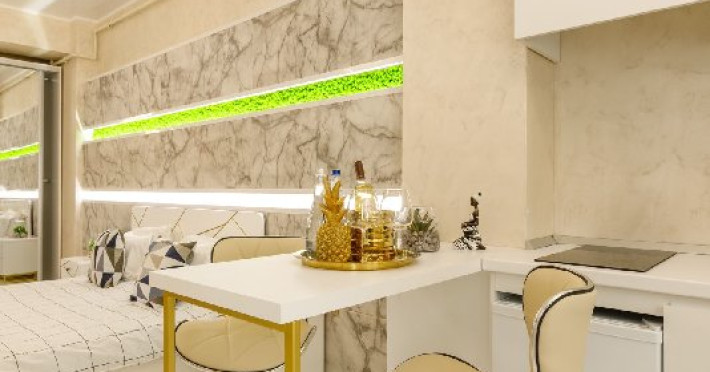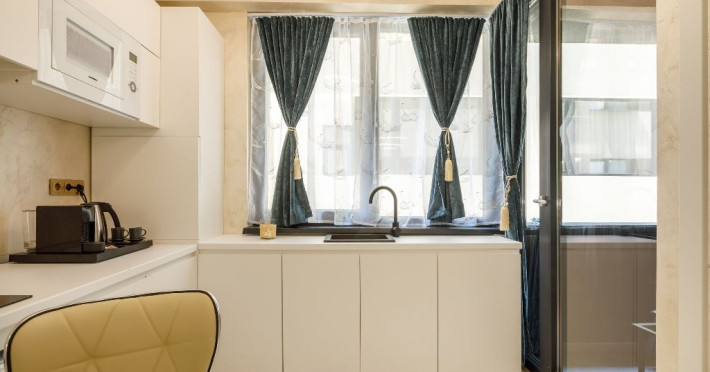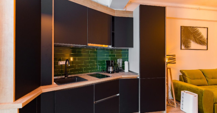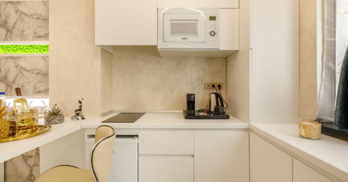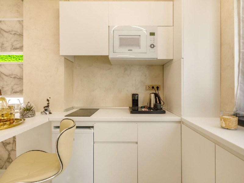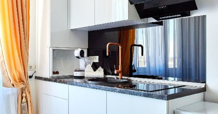 Zona de bucatarie este la fel de impresionanta, cu mobilierul alb curat si blatul care imita marmura, reflectand un gust impecabil si un simt al detaliului. Aceasta este dotata cu plita moderna , hota, aparat de cafea, frigider, vesela. Aici, o masa eleganta, acompaniata de scaune de catifea intr-un ton de verde smarald care rimeaza cu patul, isi asteapta oaspetii sa se bucure de mese intr-o atmosfera selecta. Draperiile galbene adauga un contrast cald si luminos intregii incaperi.