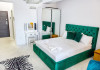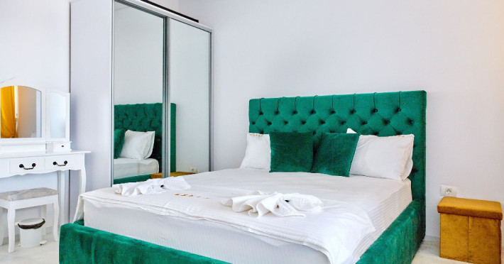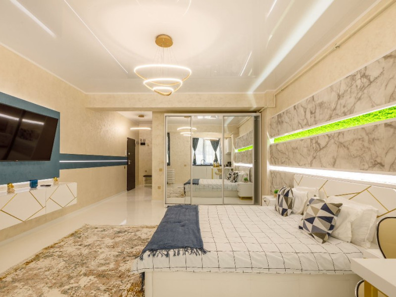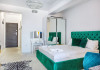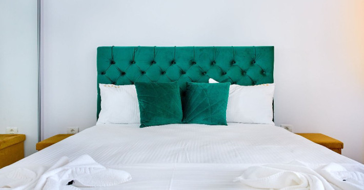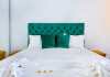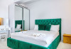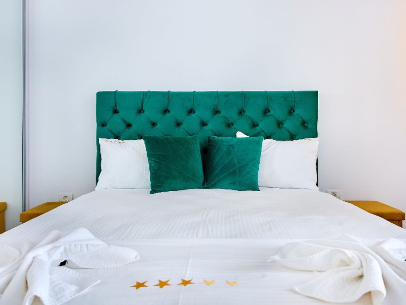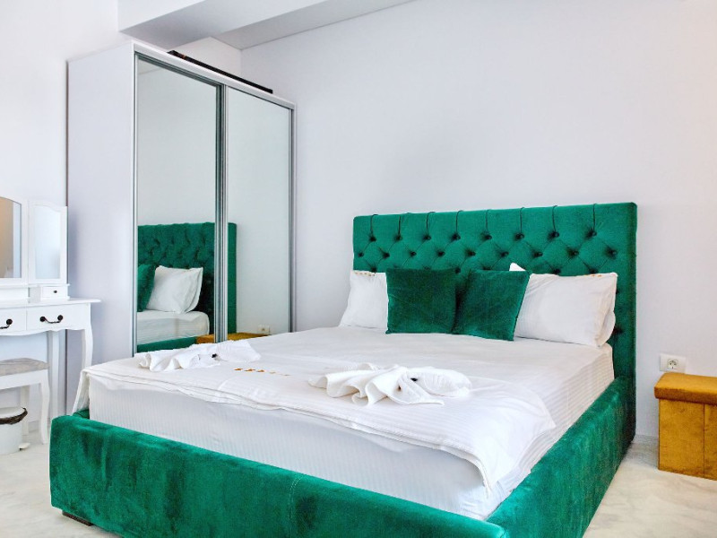 Dormitor: Dormitorul, un adevarat refugiu, pastreaza aceeasi tema de verde smarald, cu un pat matrimonial generos si draperii asortate. Lenjeria alba pe pat adauga un plus de eleganta si contrast. Televizorul modern montat pe perete permite vizionarea emisiunilor preferate direct din confortul patului.