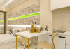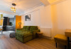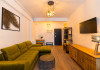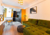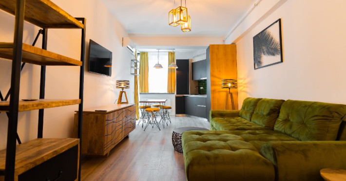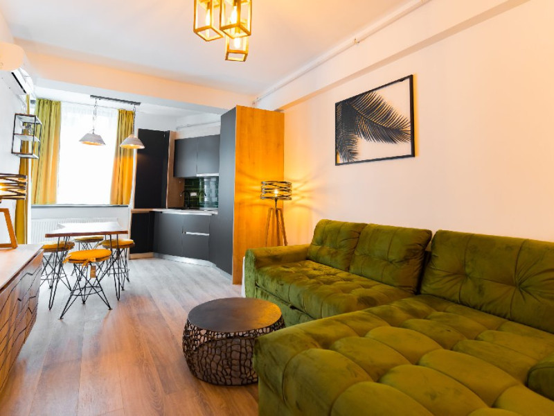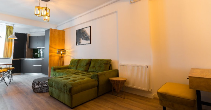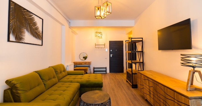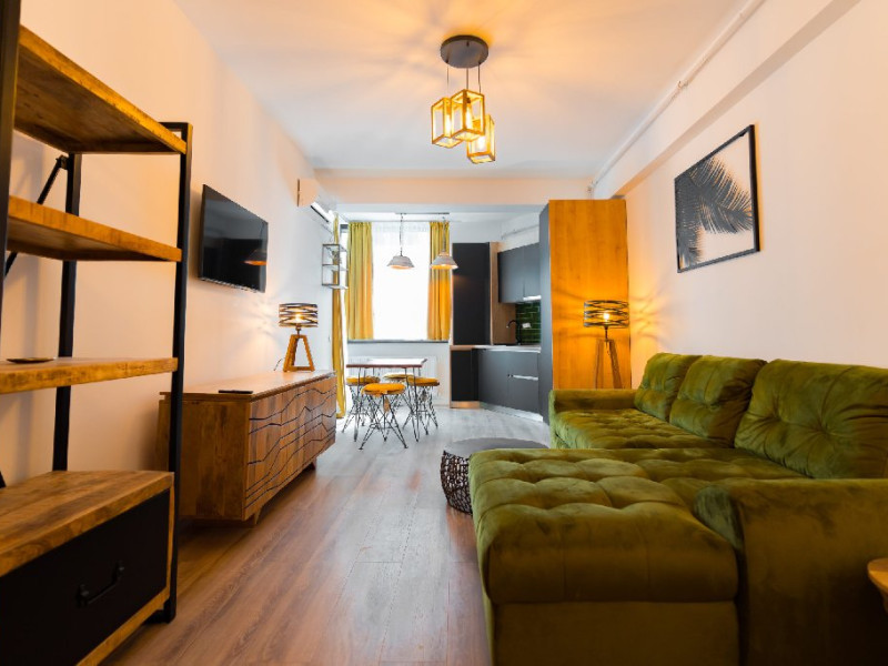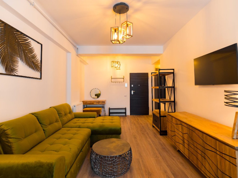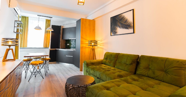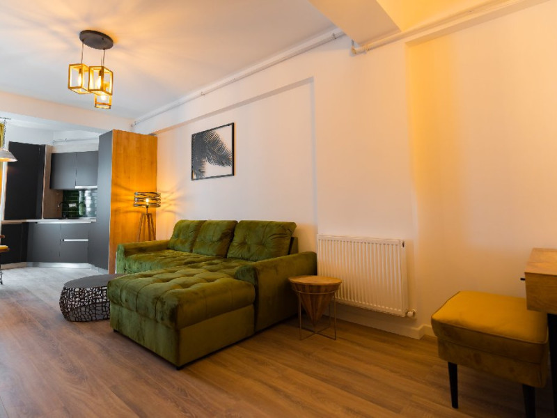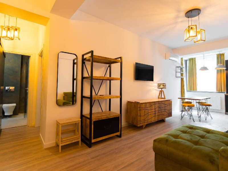 Sufragerie: Sufrageria open space a apartamentului De Beni straluceste de lux si rafinament. Canapeaua extensibila, intr-o nuanta vibranta de verde smarald, realizata din catifea, ofera un contrast sofisticat cu finisajele camerei. In fata canapelei, un televizor modern completeaza zona de relaxare, oferind un loc ideal pentru a va destinde dupa o zi lunga.