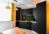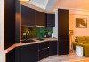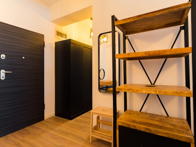 Bucataria: Bucataria, contrastand cu restul spatiului, beneficiaza de mobilier in nuante inchise de negru, care emana o eleganta aparte. Dotarile moderne din bucatarie includ o plita de gatit, aparat de cafea, frigider si spatii ample de depozitare. Toate acestea sunt integrate armonios in design, oferind functionalitate si stil.