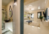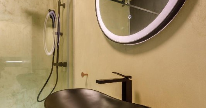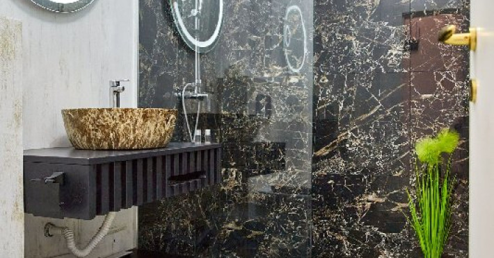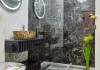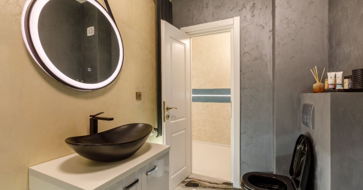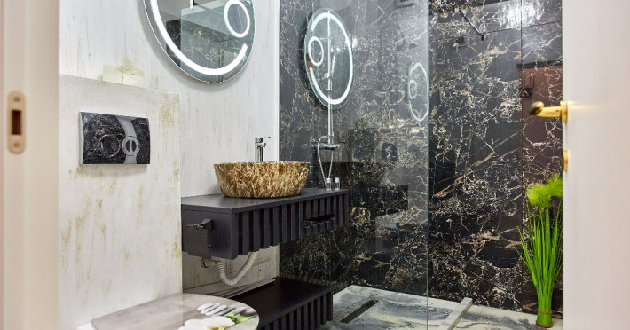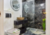 Baia este un sanctuar modern si sofisticat, cu faianta in tonuri de negru si alb care creeaza un fundal clasic. Dusul walk-in promite o experienta revigoranta, in timp ce detaliile mobilierului de lux accentueaza atmosfera de exclusivitate. Oglinda, inramata de lumini, adauga o aura de glamour si utilitatea moderna este asigurata de prezenta unei masini de spalat, facand din acest spatiu nu doar unul frumos, dar si functional.
