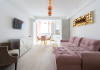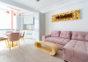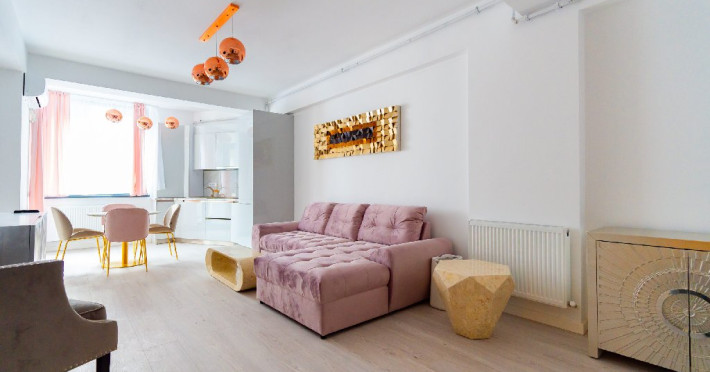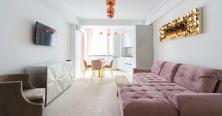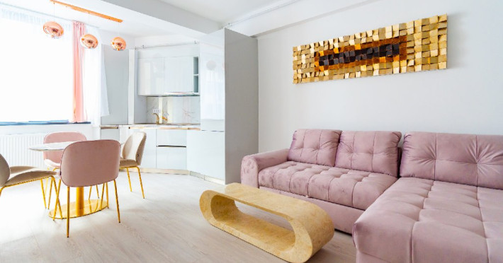 Sufragerie Open-Space: Intrand in spatiul de zi, ochiul este imediat atras de canapeaua extensibila, moale, de catifea, in nuanta delicata de roz pal. Aerul modern si minimalist este accentuat de tonurile predominante de alb, care dau o senzatie de prospetime si spatiozitate.
