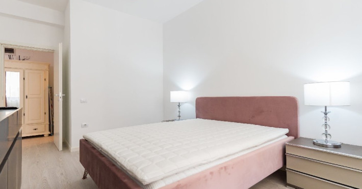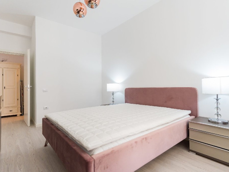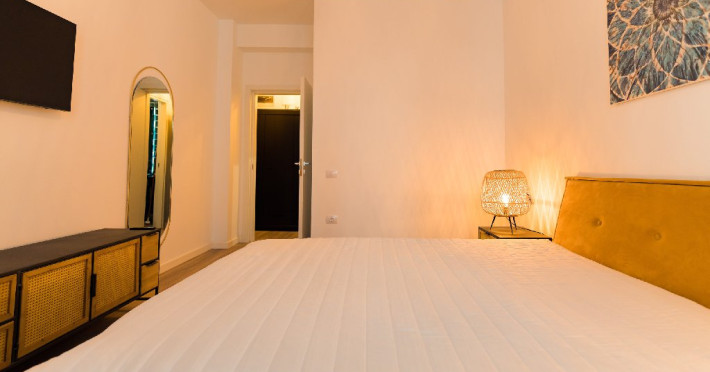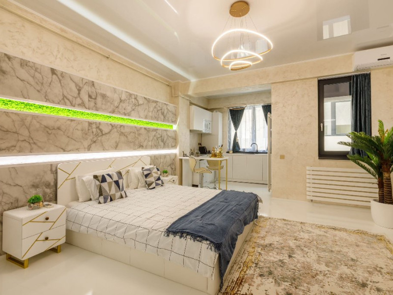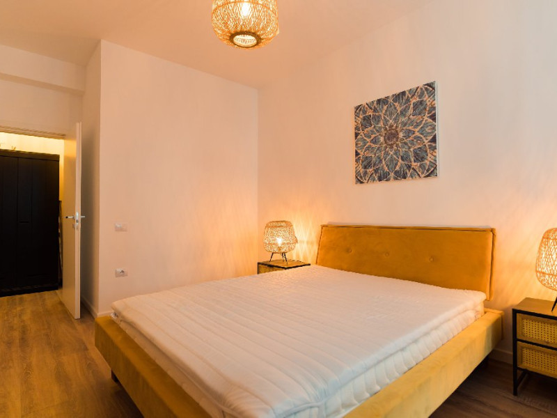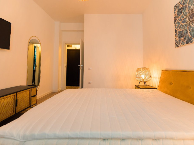Dormitor: Acest spatiu este un sanctuar al relaxarii. Patul matrimonial cu o saltea confortabila, este insotit de un televizor modern. In plus, dormitorul beneficiaza de un dressing spatios, care ofera suficient loc pentru toate lucrurile personale.