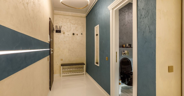 Baie: Baia, un exemplu de modernism si lux, este dotata cu o cabina de dus walk-in si faianta neagra cu aspect de marmura care emana opulenta. Masina de spalat moderna adauga o nota practica, facand din rutina zilnica o experienta placuta.