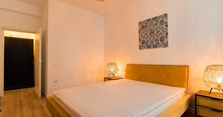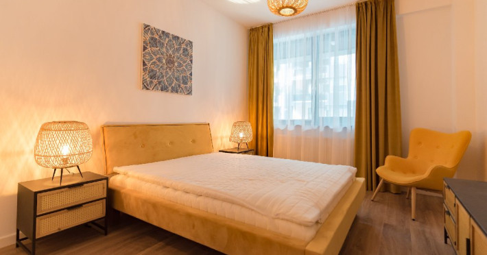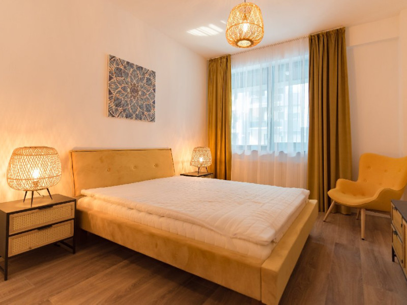 Dormitorul: Dormitorul este o declaratie a elegantei simple. Elementele din lemn continua tema naturala, in timp ce draperiile in nuante de mustar adauga un strop de culoare si vioiciune spatiului. Televizorul montat in dormitor ofera confort suplimentar, permitandu-va sa va relaxati in pat in timp ce vizionati emisiunile preferate.