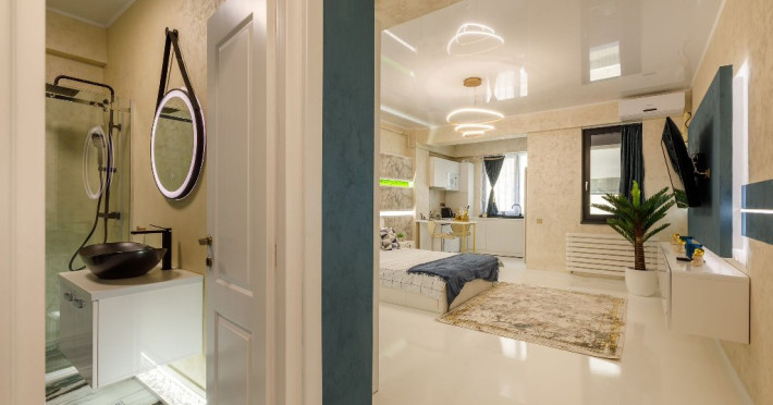 Baia: Baia este un exemplu de design modern si luxos. Fiecare detaliu a fost gandit cu grija, de la chiuveta la cabina de dus walk-in. Materialele de calitate superioara si finisajele rafinate transforma baia intr-un spatiu unde functionalitatea se imbina cu estetica.