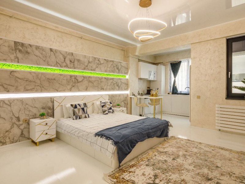 Bucatarie: Bucataria, in acelasi ton de lux, este echipata cu cele mai noi aparate si utilitati. Contoarele lustruite si mobilierul elegant demonstreaza un simt al detaliului si al calitatii. Dotarile includ o plita electrica moderna, aparat de cafea, un frigider spatios si alte ustensile esentiale pentru gatit, facand din gatit o adevarata placere.