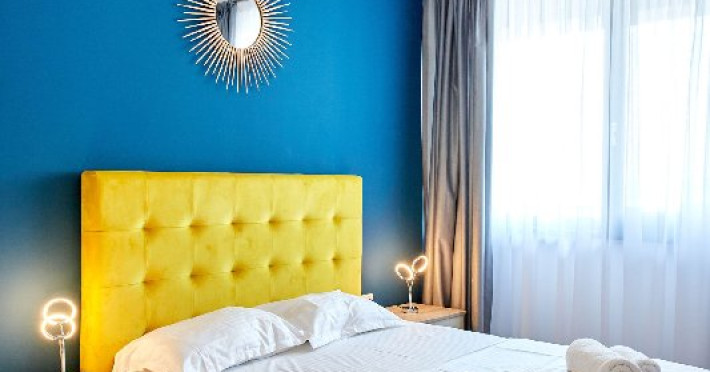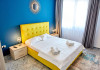 - Un dormitor primitor cu un pat matrimonial in nuante de galben, oferind un somn odihnitor si reconfortant.