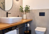 Baia, cu design modern si contemporan, este un exemplu de eleganta si rafinament. Fiecare detaliu este gandit pentru a oferi un spatiu de relaxare si revitalizare. Cabina de dus walk in, cu geamuri transparente si finisaje de calitate, adauga o nota de lux si stil incaperii.