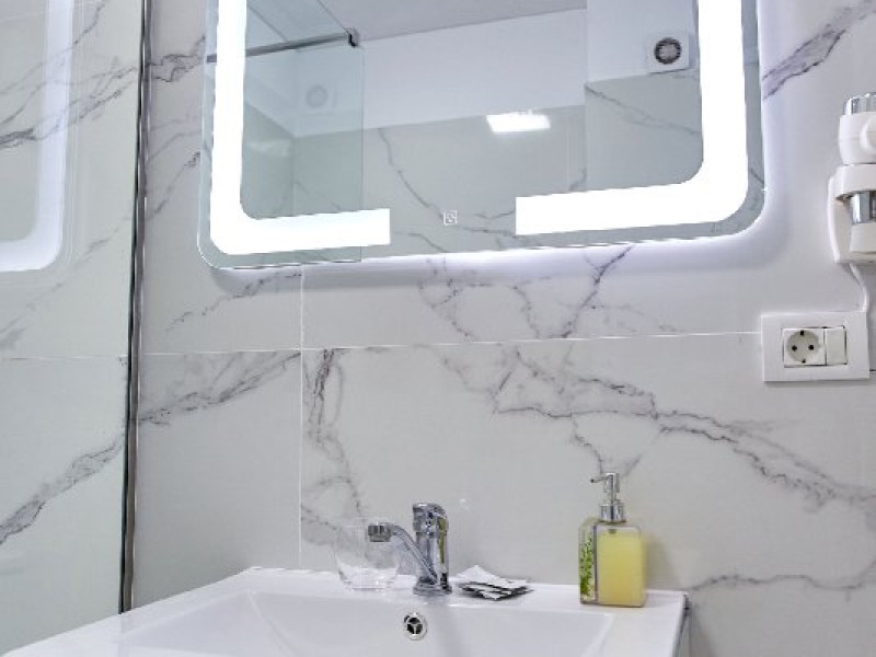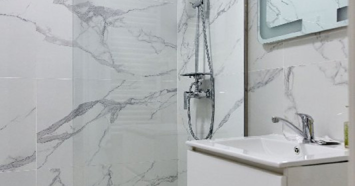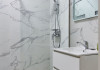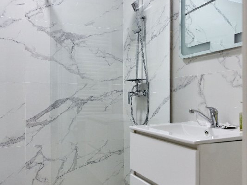 Baie: Baia impresioneaza prin faianta in stil marmura si dispune de un dus walk-in modern. Finisajele de calitate completeaza aspectul spatios si luxos al baii.