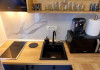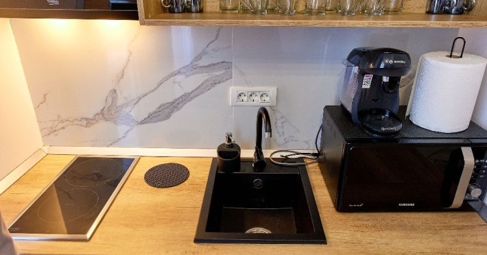 Bucataria este dotata cu toate utilitatile necesare pentru a pregati mese delicioase ( aragaz , cuptor cu microunde , aparat de cafea , frigider). Designul modern se imbina perfect cu functionalitatea, oferind spatiu de depozitare si o zona de gatit eficienta. In fata bucatariei, o masa de servit mesele ofera privelistea superba a marii, vizibila prin fereastra generoasa, transformand fiecare masa intr-o experienta placuta.