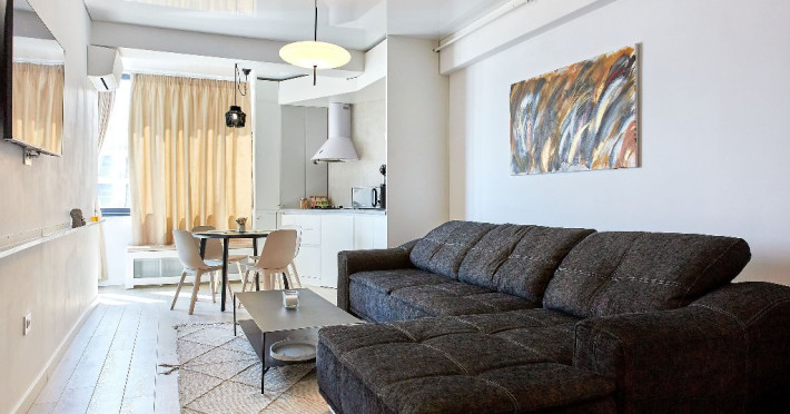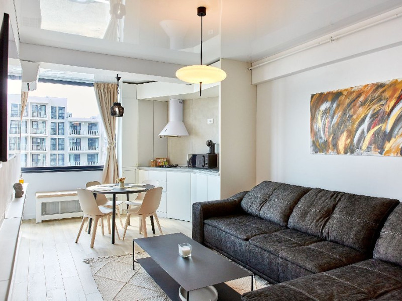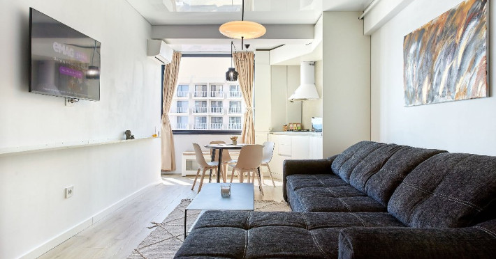 In apartamentul Sea la Vie, sufrageria open space se distinge prin alegerea designului elegant si a culorilor neutre. Canapeaua extensibila neagra ofera un contrast puternic cu tonurile deschise ale incaperii, invitand la momente de relaxare. Televizorul, montat strategic pe perete in fata canapelei, este ideal pentru seri de film sau pentru a urmari emisiuni preferate.