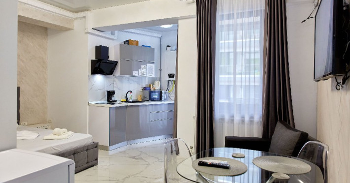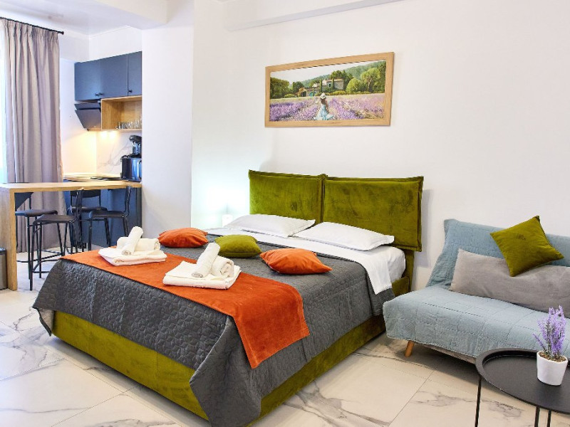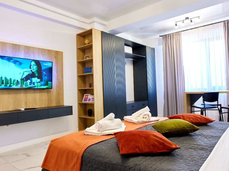 Confort si Eleganta in Dormitor: Studio-ul nostru va intampina cu un pat matrimonial confortabil, in fata caruia se afla un televizor smart pentru seri relaxante de divertisment. Langa pat, un fotoliu extensibil adauga flexibilitate si confort, permitand cazarea a pana la 3 persoane.