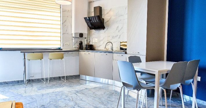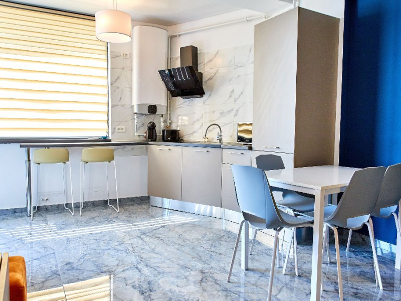 Bucura-te de Mese Delicioase: Zona de bucatarie este amenajata cu un colt de luat masa, dotat cu un coltar confortabil si scaune elegante. Aici veti gasi tot ce aveti nevoie pentru a pregati cele mai delicioase mese, de la plita si cuptor cu microunde la aparat de cafea si frigider.
