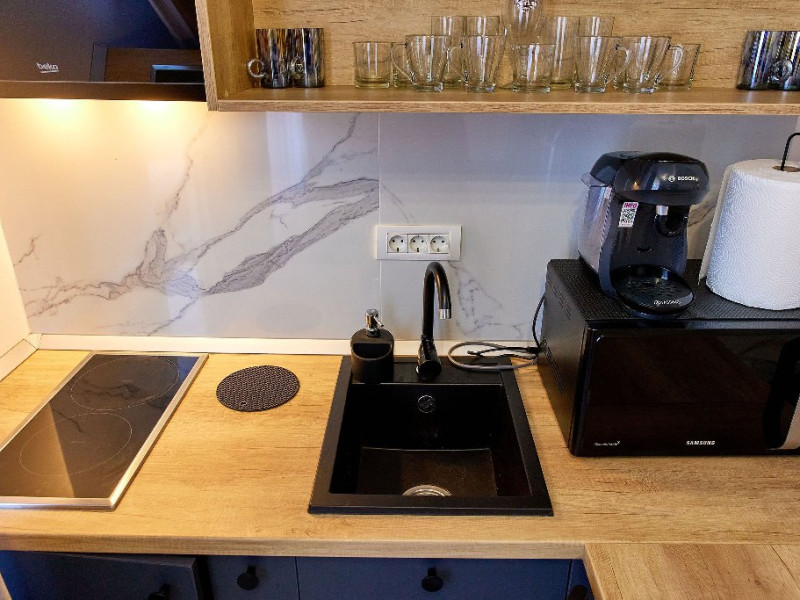 - Echipata cu plita, hota, cuptor cu microunde, aparat de cafea, prajitor de paine si alte ustensile de bucatarie.