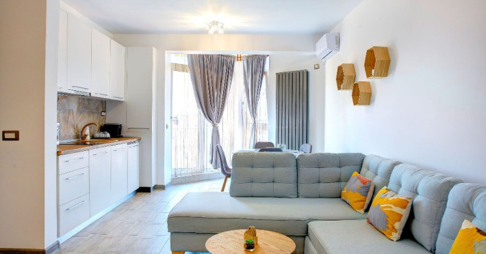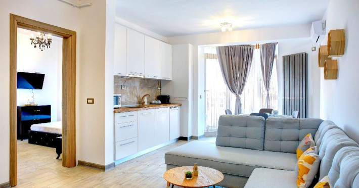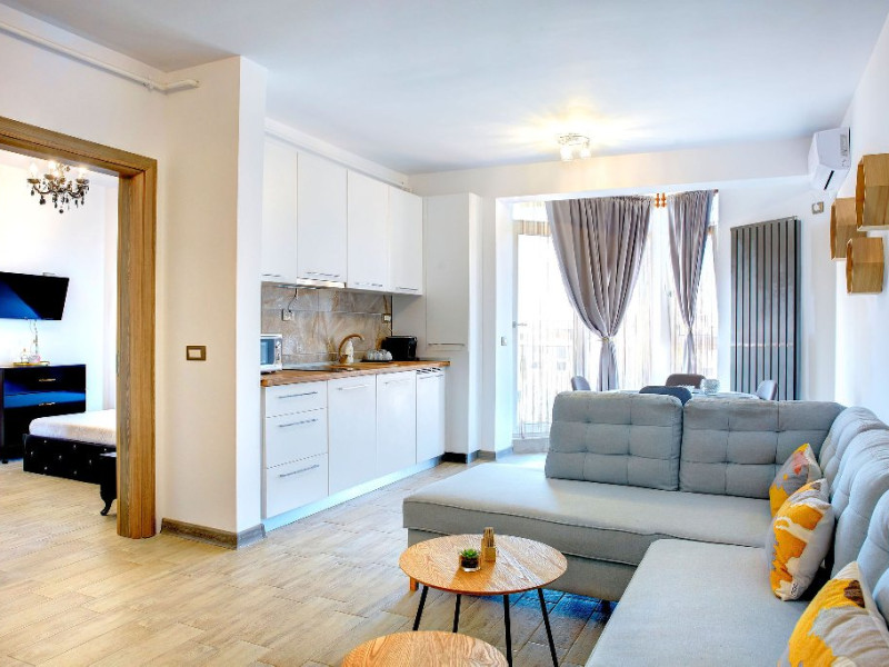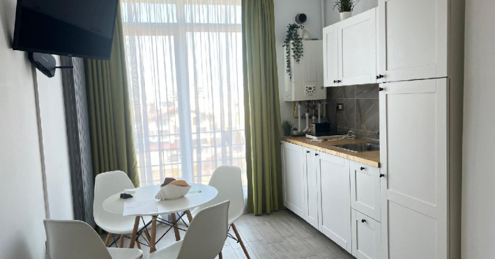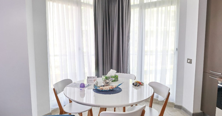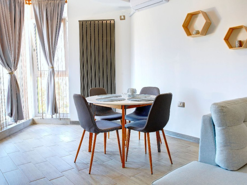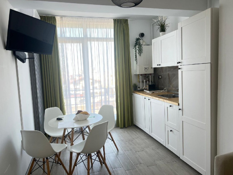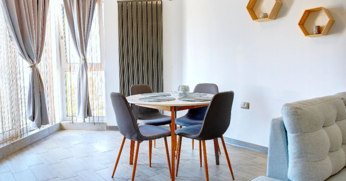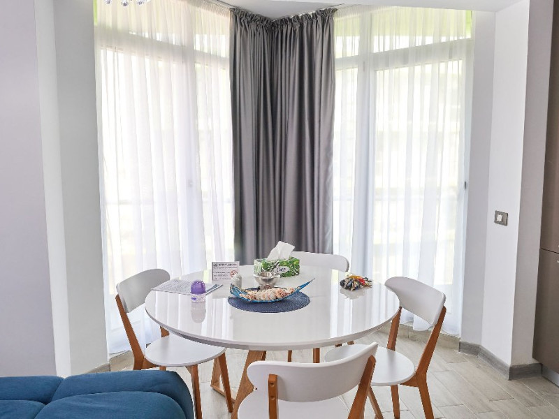 Bucataria, definita prin linii curate si un design aerisit, dispune de mobilier alb, ce creeaza o atmosfera de spatiu si lumina. Dotarile moderne asigura toate necesitatile culinare, iar masa rotunda, flancata de scaune albe, constituie punctul central pentru servirea meselor, aducand o nota de eleganta si simplitate. Televizorul, strategic plasat pe perete, poate fi vizionat atat din zona de luat masa, cat si din confortul canapelei.