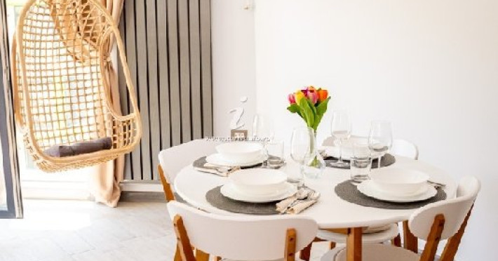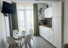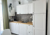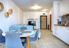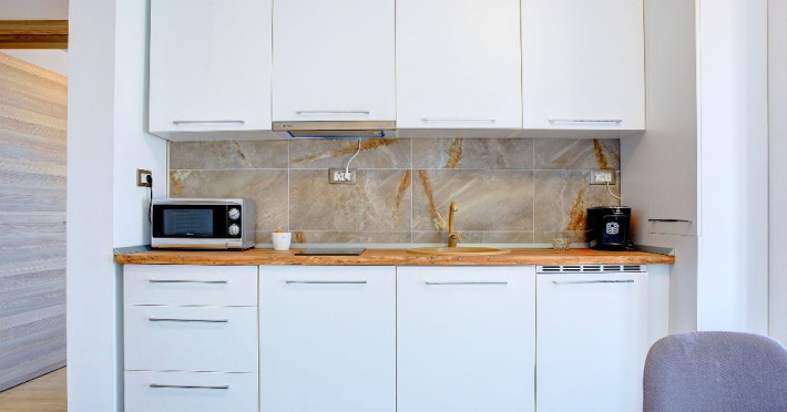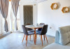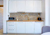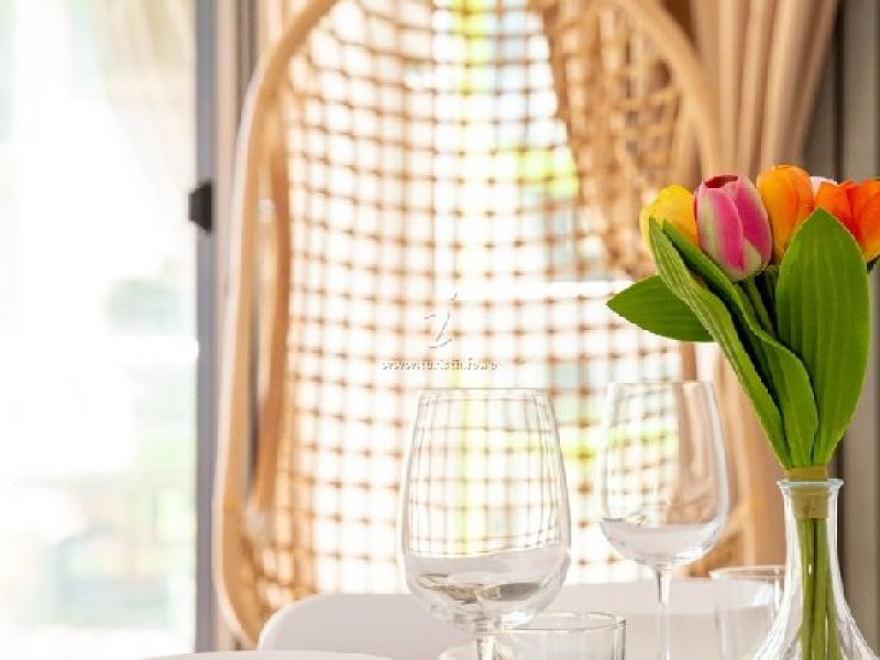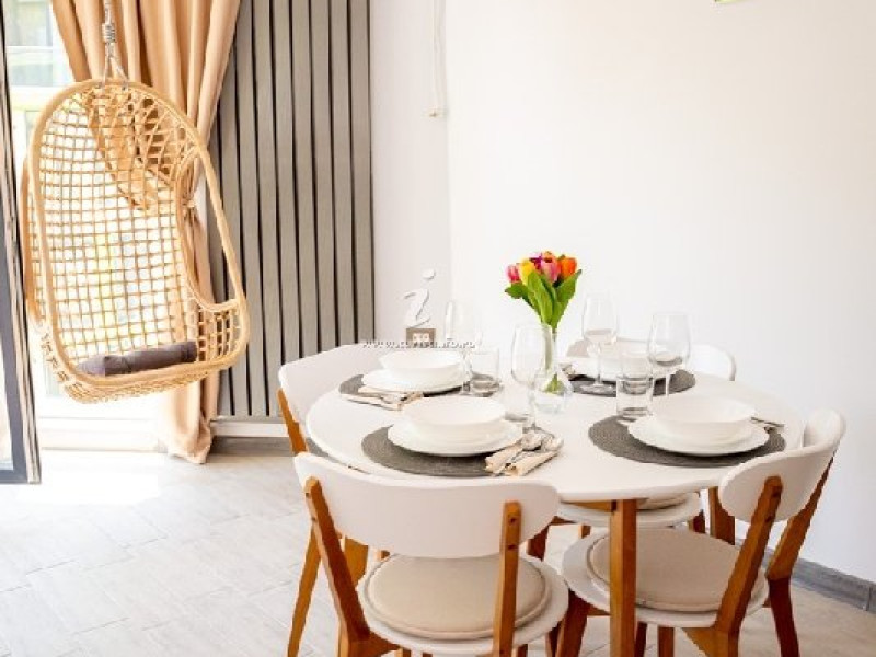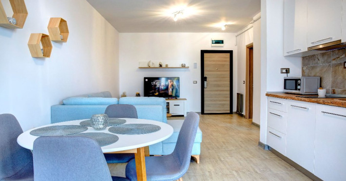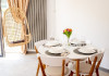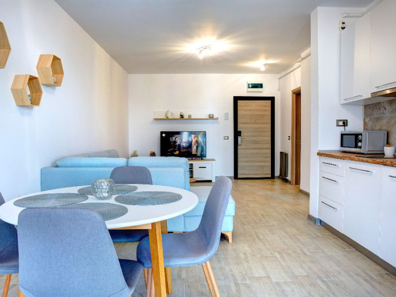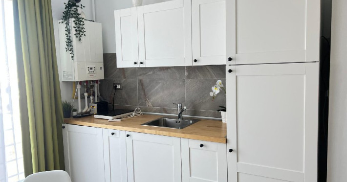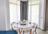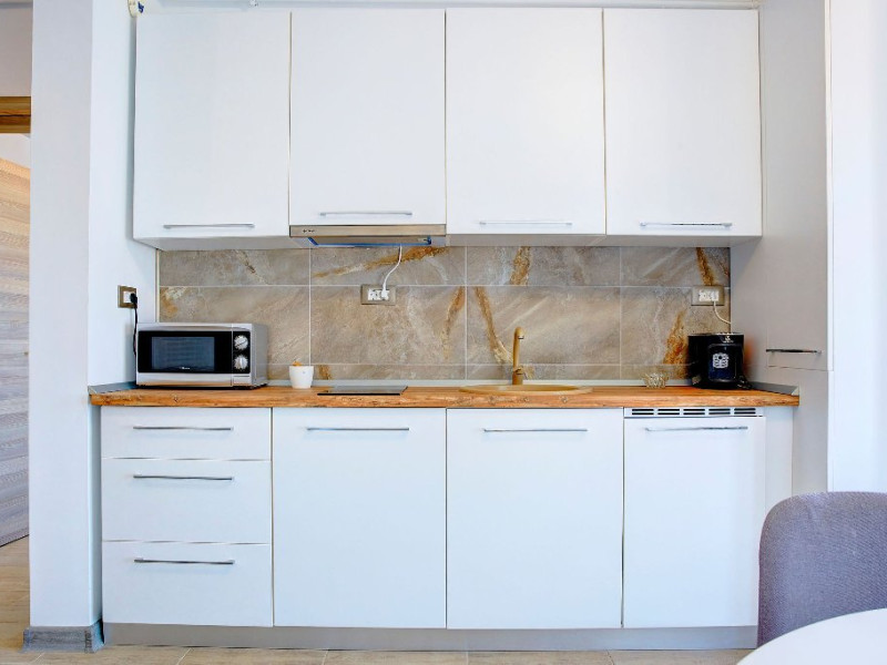 Bucataria, definita prin linii curate si un design aerisit, dispune de mobilier alb, ce creeaza o atmosfera de spatiu si lumina. Dotarile moderne asigura toate necesitatile culinare, iar masa rotunda, flancata de scaune albe, constituie punctul central pentru servirea meselor, aducand o nota de eleganta si simplitate. Televizorul, strategic plasat pe perete, poate fi vizionat atat din zona de luat masa, cat si din confortul canapelei.