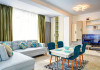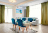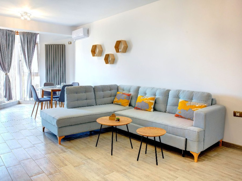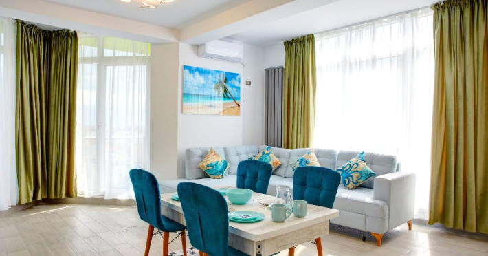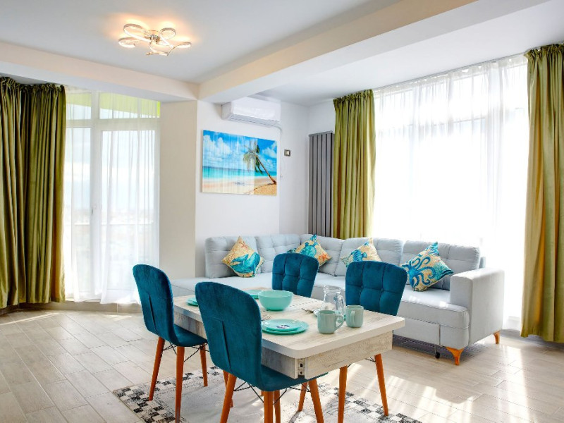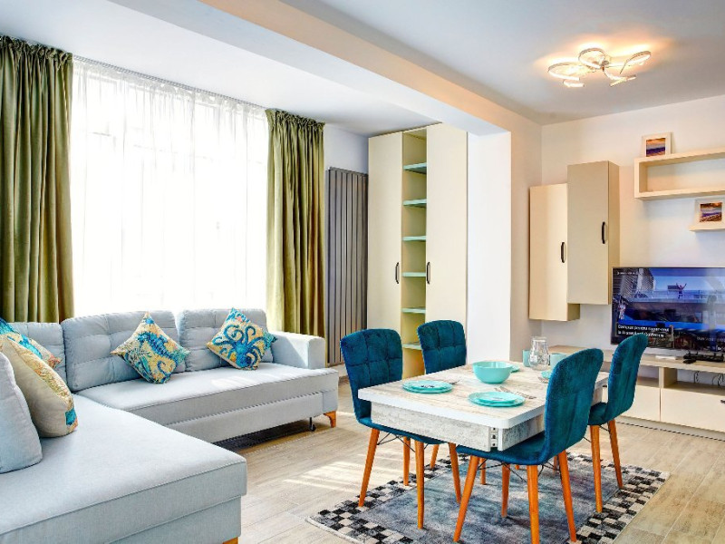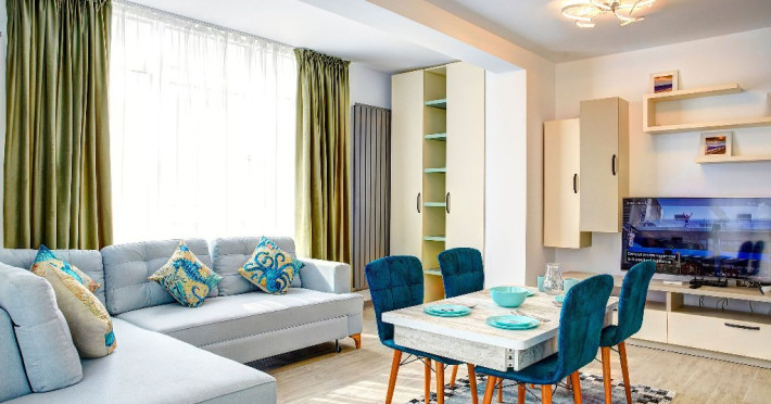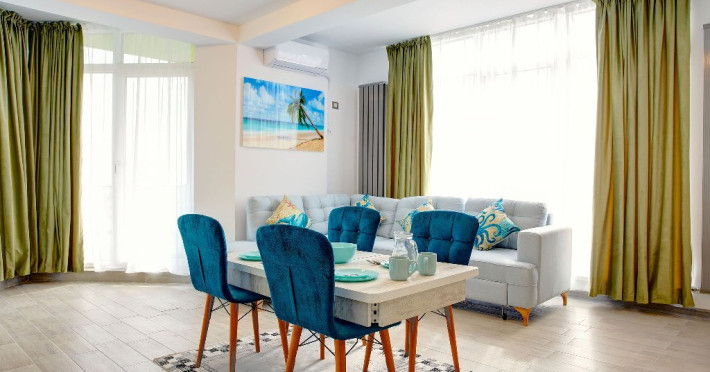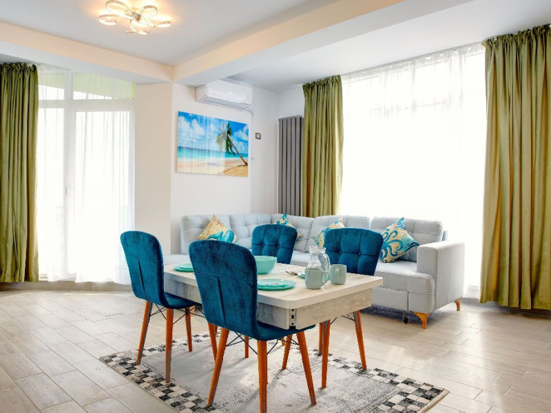 Apartamentul Madagascar din Complexul Alezzi se deschide catre o sufragerie open space, vibranta si plina de viata. Designul modern este accentuat de tonurile colorate care anima spatiul. Canapeaua extensibila, in nuante de gri, este imbratisata de perne albastre, adaugand un strop de culoare si confort. Masa de servit mesele este alba, avand scaune intr-un albastru intens care atrage privirea. In centrul sufrageriei, televizorul modern sta mandru pe un mobilier alb, elegant, oferind optiuni de divertisment pentru oaspeti.