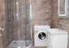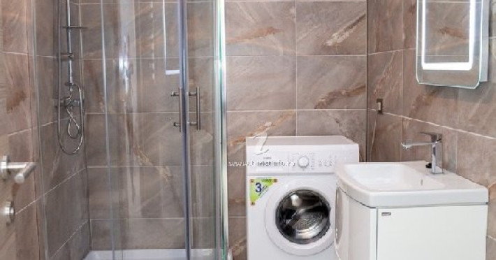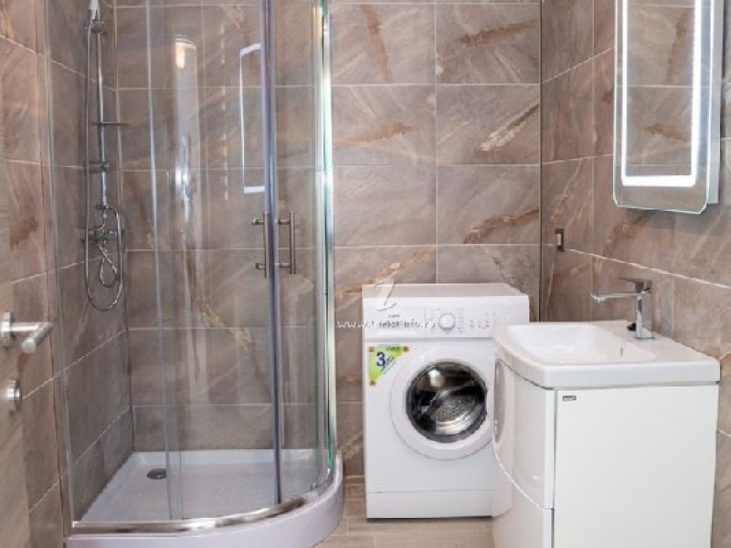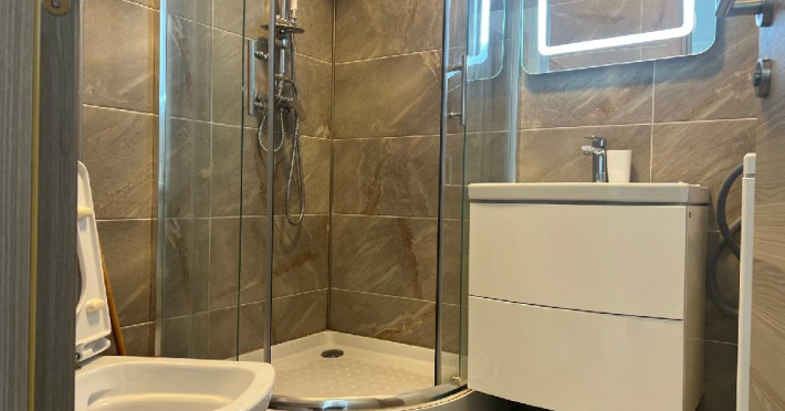 Baia, cu un design modern, dispune de o cabina de dus spatioasa, unde poti sa te relaxezi dupa o zi lunga. Fiecare detaliu este gandit pentru confort, de la chiuveta la dulapioarele de depozitare. In plus, masina de spalat moderna asigura ca toate nevoile de ingrijire a hainelor sunt satisfacute.