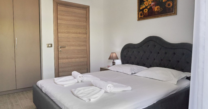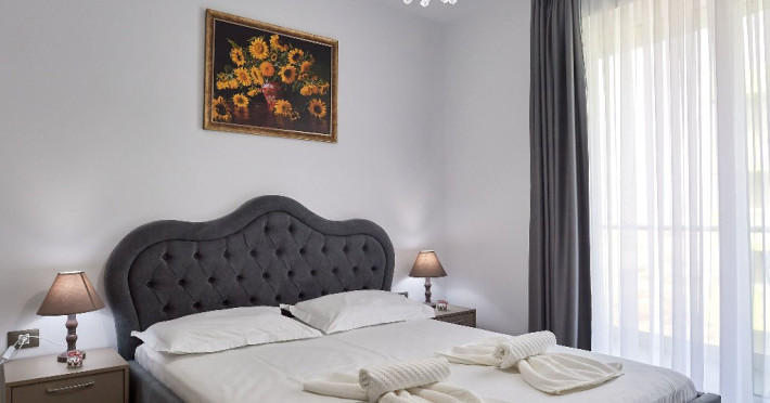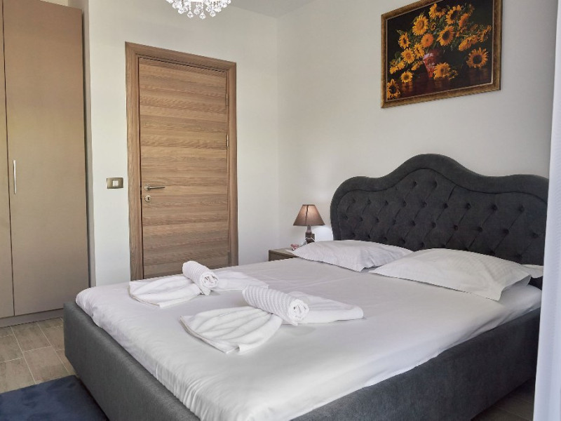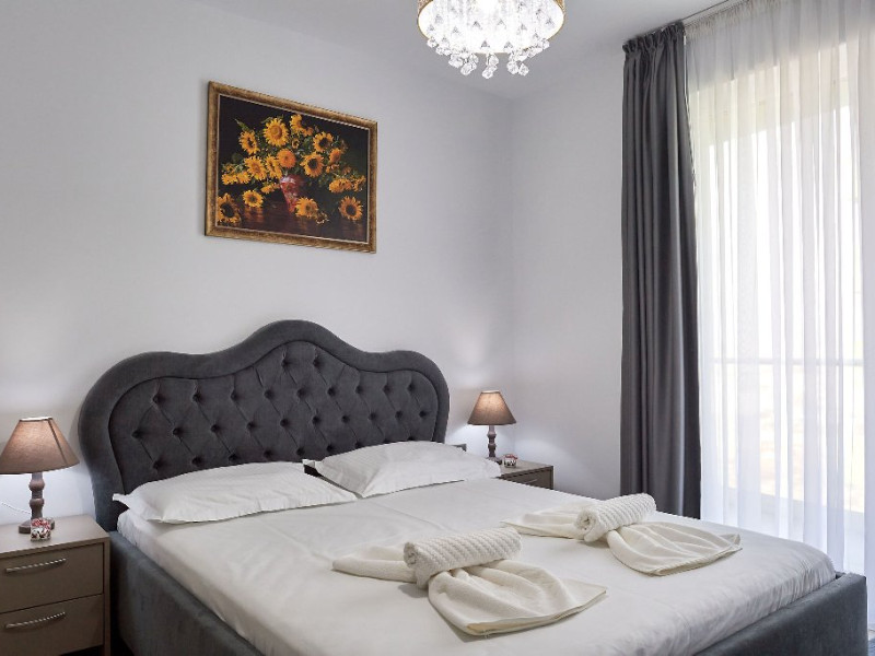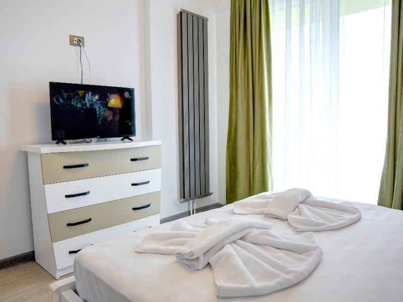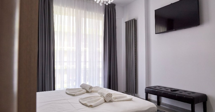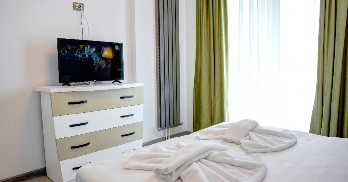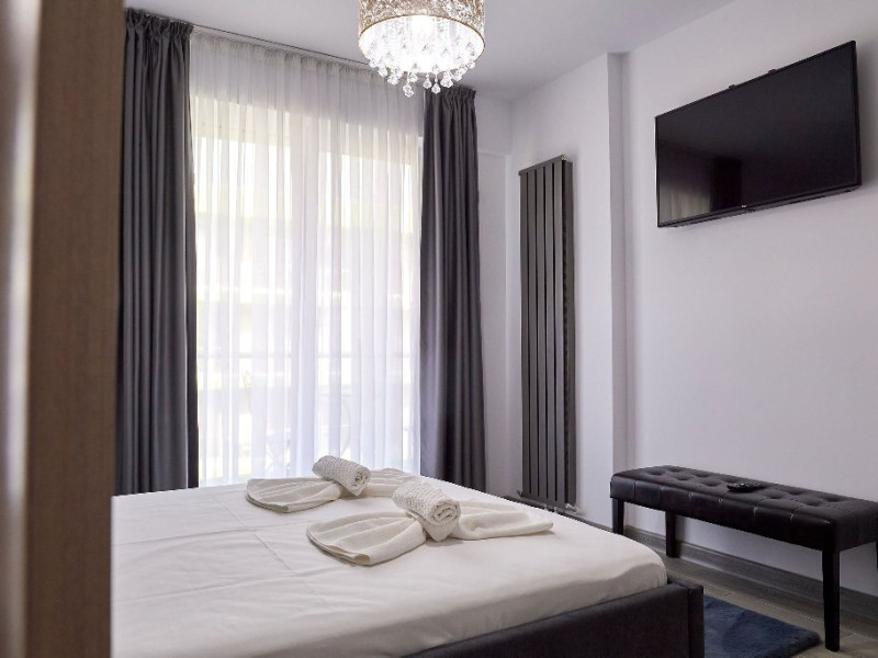 Dormitorul este o adevarata oaza de relaxare. Patul matrimonial, cu lenjeria sa imaculata, promite odihna si confort. Draperiile in nuante de verde adauga un plus de prospetime si intimitate. Televizorul montat strategic ofera posibilitatea vizionarii filmelor sau a emisiunilor favorite direct din confortul patului.