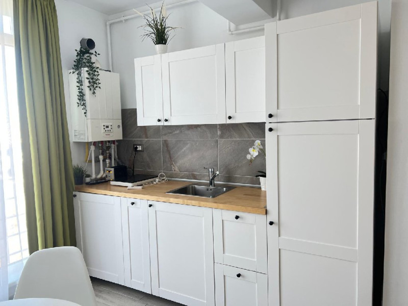 Bucataria, cu un design impecabil, se remarca printr-o mobila alba, ce ofera o senzatie de spatiu si prospetime. Echipata complet cu aragaz, frigider, cuptor cu microunde si cafetiera, bucataria este pregatita pentru orice provocare culinara. Zona de dining este reprezentata de o masa rotunda, ideala pentru mesele in familie sau cu prietenii. Accesoriul care fura privirea este fara indoiala scaunul suspendat de langa geam, un loc perfect pentru a citi o carte sau pentru a savura o cafea dimineata.