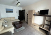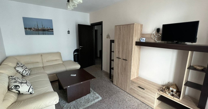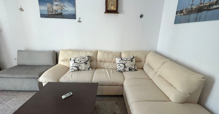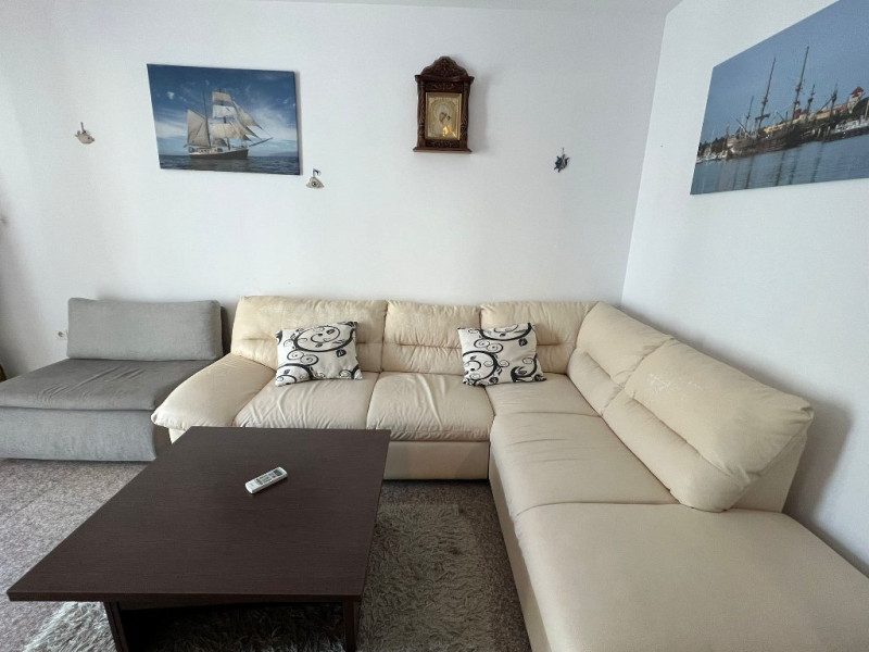 Sufrageria este un spatiu generos si aerisit, accentuat de o canapea extensibila mare din piele de culoare bej. Mobilierul modern ofera mult spatiu de depozitare si este complementat de un televizor de ultima generatie. Eleganta camerei este amplificata de lumina naturala care patrunde prin fereastra larga, oferind o priveliste splendida catre mare. Iesirea catre balcon adauga un plus de valoare spatiului, invitandu-te sa te relaxezi in sunetul valurilor.