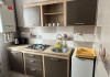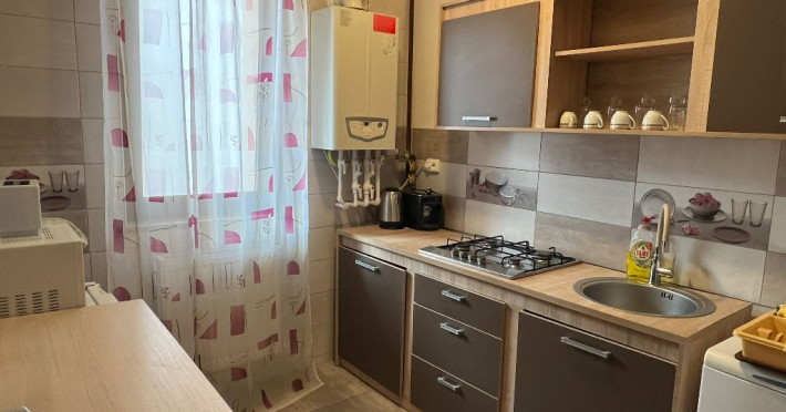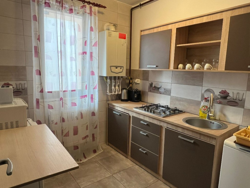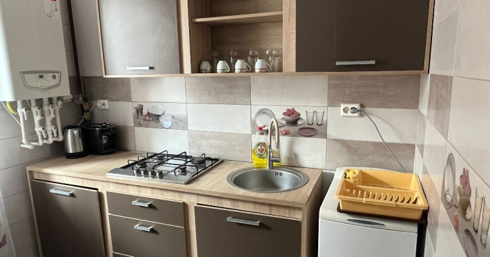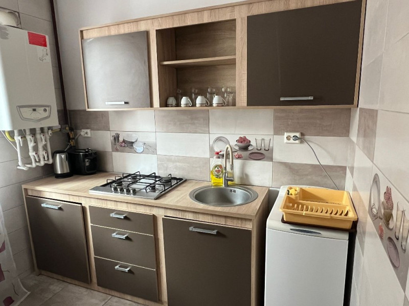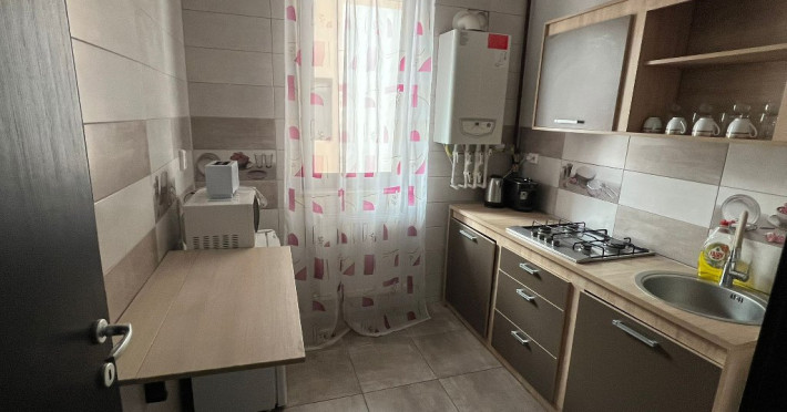 Bucataria, desi separata, este optim organizata si dotata cu toate utilitatile esentiale. Blaturile de lucru sunt spatioase, iar mobilierul este conceput pentru a oferi suficient spatiu de depozitare. Culorile neutre si finisajele lucioase ale mobilierului adauga o nota de modernism si eleganta.