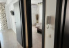 Dormitorul este un sanctuar al linistii si relaxarii. Un pat matrimonial confortabil este amplasat central, iar in fata lui, pe perete, se afla un televizor modern. Designul camerei este caracterizat de tonuri deschise si linii curate, iar dressingul spatios ofera solutii ample de depozitare pentru garderoba.