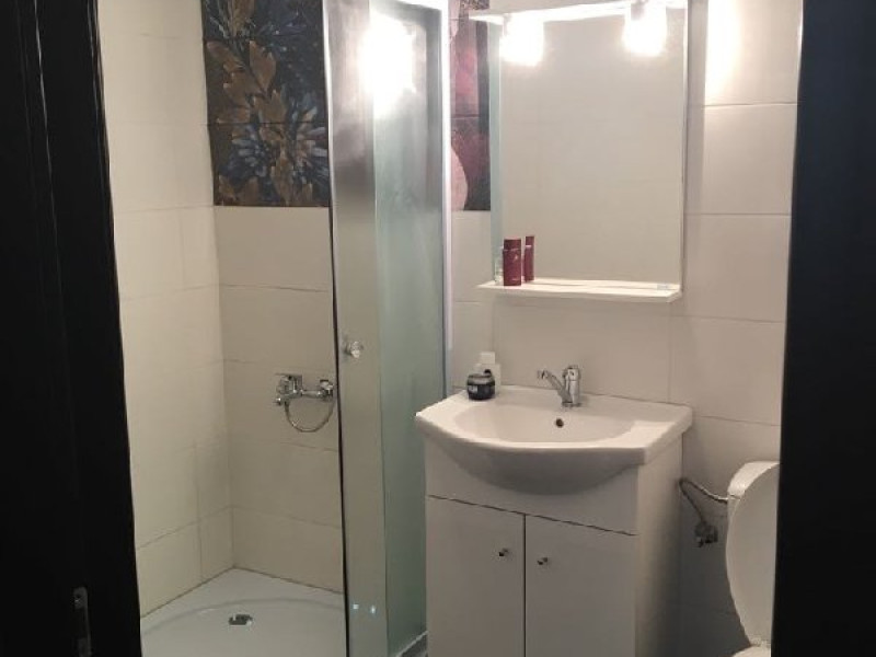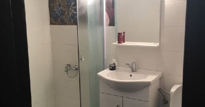 Baia este un amestec de functionalitate si stil. O cabina de dus moderna, cu geamuri transparente, domina spatiul. Chiuveta si toaleta sunt montate ergonomic, iar faianta si gresia in tonuri neutre adauga un aer de prospetime si curatenie.