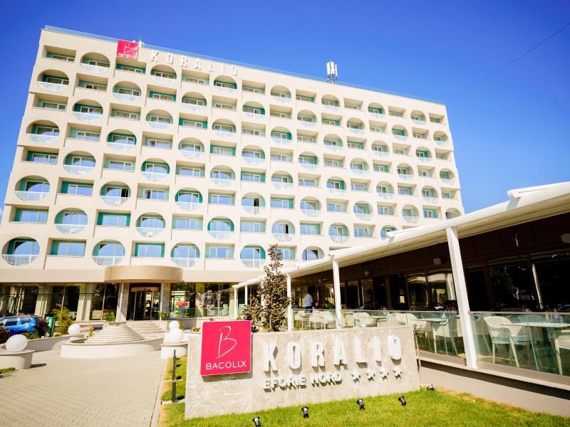 Hotelul Bacolux Koralio (fost Hefaistos) este situat in centrul statiunii Eforie Nord, la 600 m de plaja Belona (cca 9 minute de mers pe jos). Facilitati hotel: 212 camere si apartamente, restaurant (400 locuri), 2 terase, lobby bar (50 locuri), Aqua Fun (3 piscine exterioare: 1 piscina pentru adulti de dimensiuni semi olimpice si 2 piscine pentru copii, 3 tobogane cu apa), locuri de joaca pentru copii, 2 sali de conferinta, parcare. Facilitati camere: - Queen Clasic Family: Wi-Fi, TV, sistem de climatizare, telefon, minibar, seif, papuci, articole de baie, uscator de par, baie cu cabina de dus, balcon. - Koralio: Wi-Fi, AC, TV, telefon, minibar, seif, papuci, articole de baie, uscator de par, baie cu cabina de dus, balcon. - King Deluxe: Wi-Fi, AC, TV, telefon, minibar, seif, expresor cu capsule cafea, ceai și zahar, papuci, articole de baie, uscator de par, baie cu cabina de dus, perie de haine, balcon. - Executive Suite: Wi-Fi, AC, TV, telefon, minibar, seif, expresor cu capsule cafea, ceai și zahar, papuci, articole de baie, uscator de par, 2 bai (1 baie cu cada + 1 baie cu cabina de dus), perie de haine, 2 balcoane.