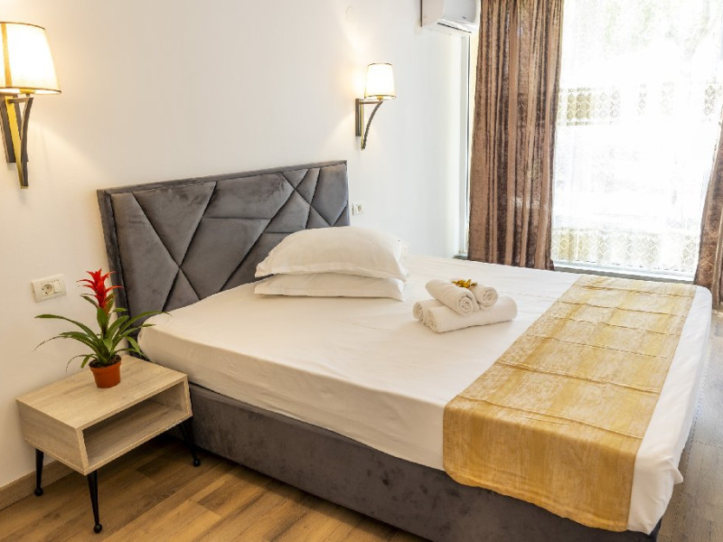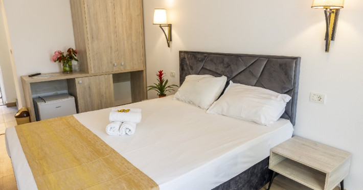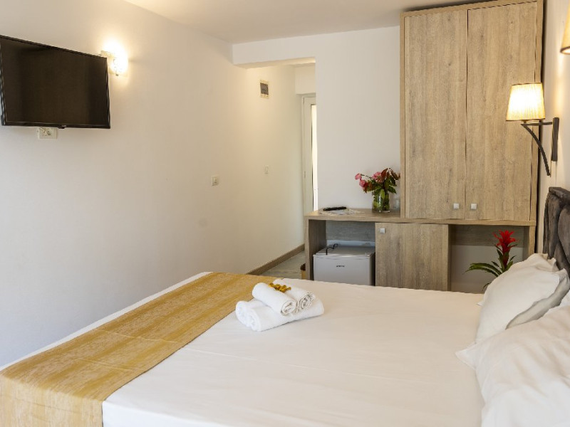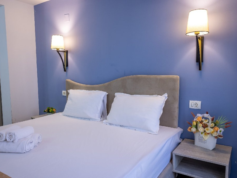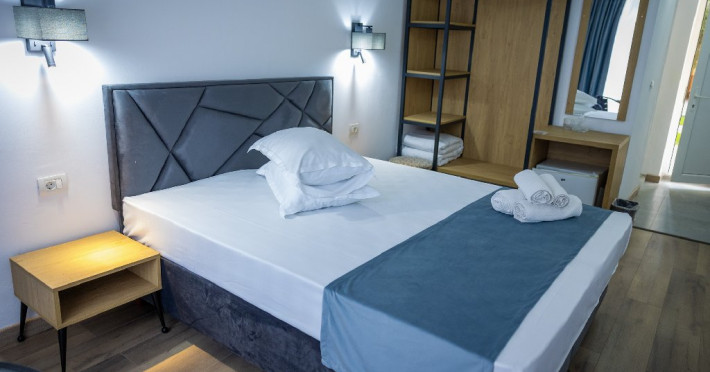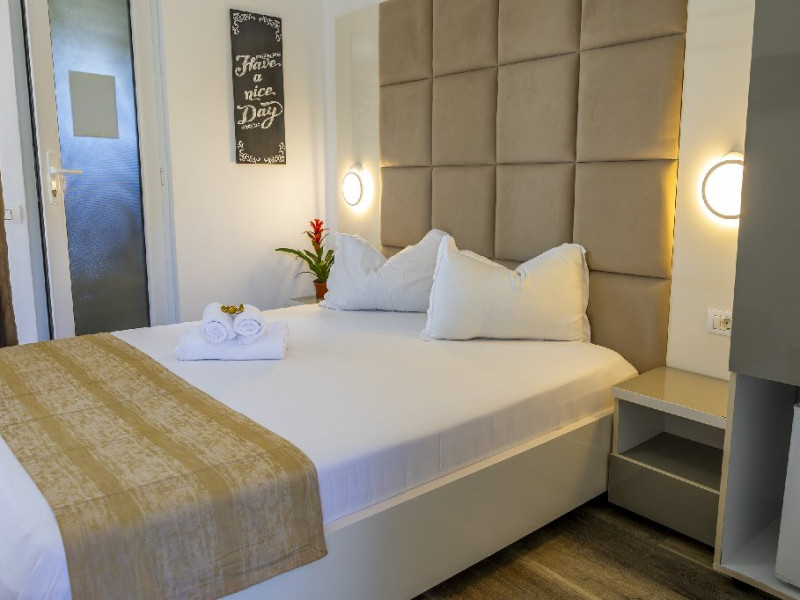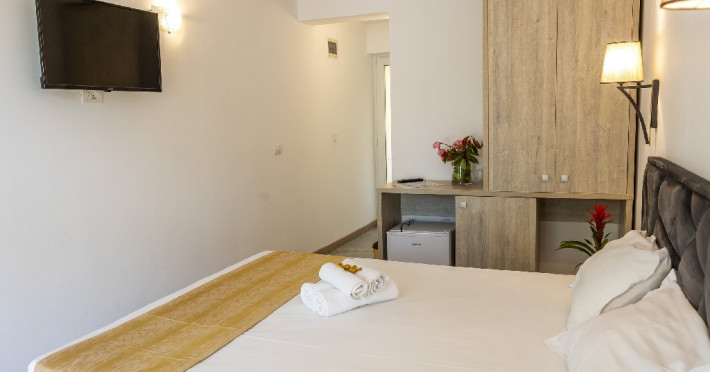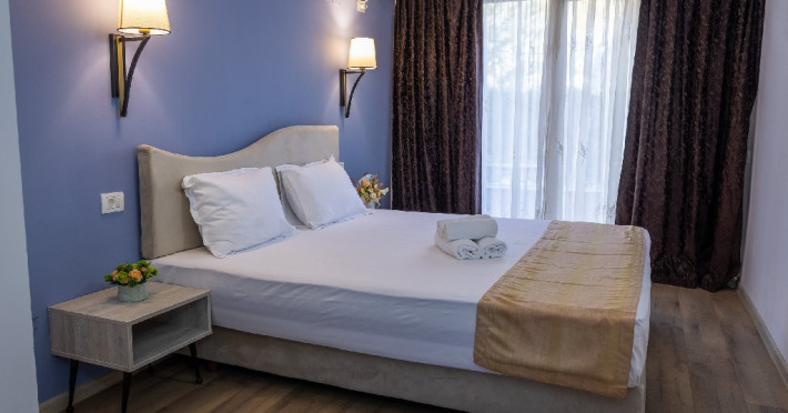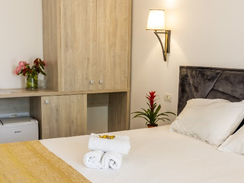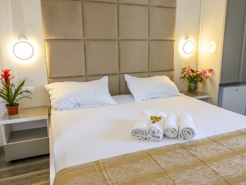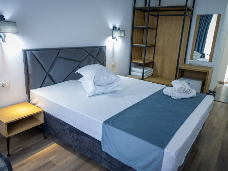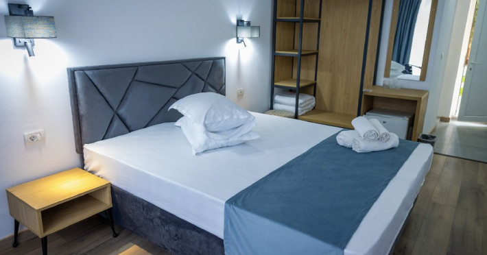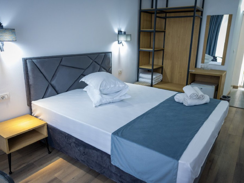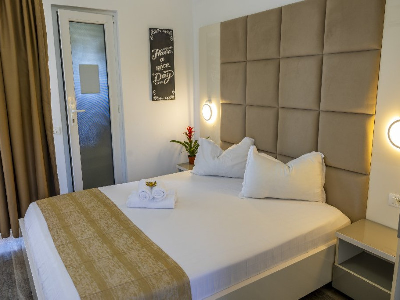 Camerele duble superioare, impartite in corpuri de cladiri cu regim de inaltime parter, au in dotare pat matrimonial si terasa privata.