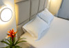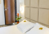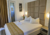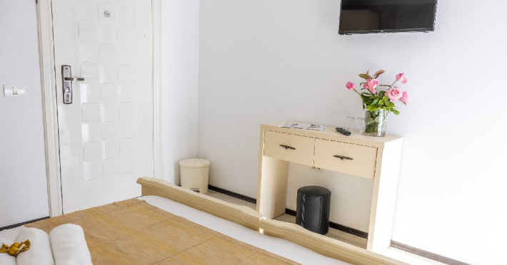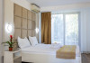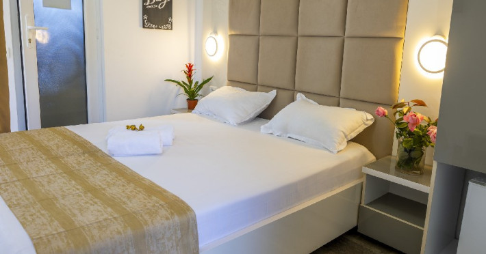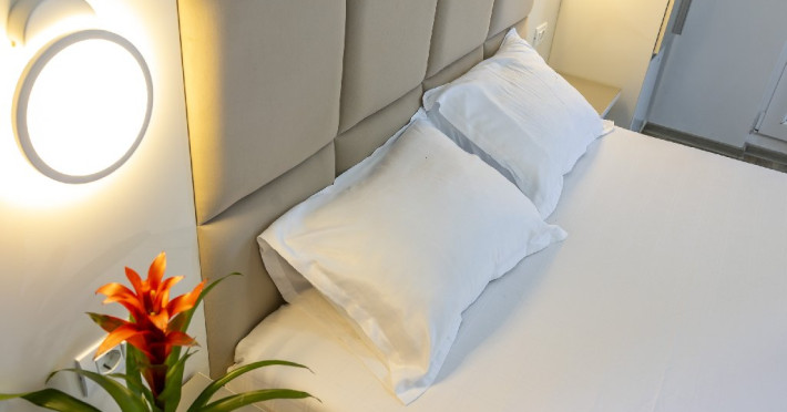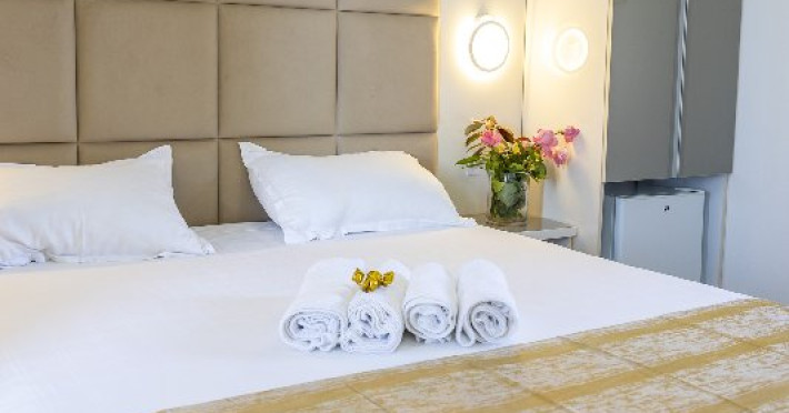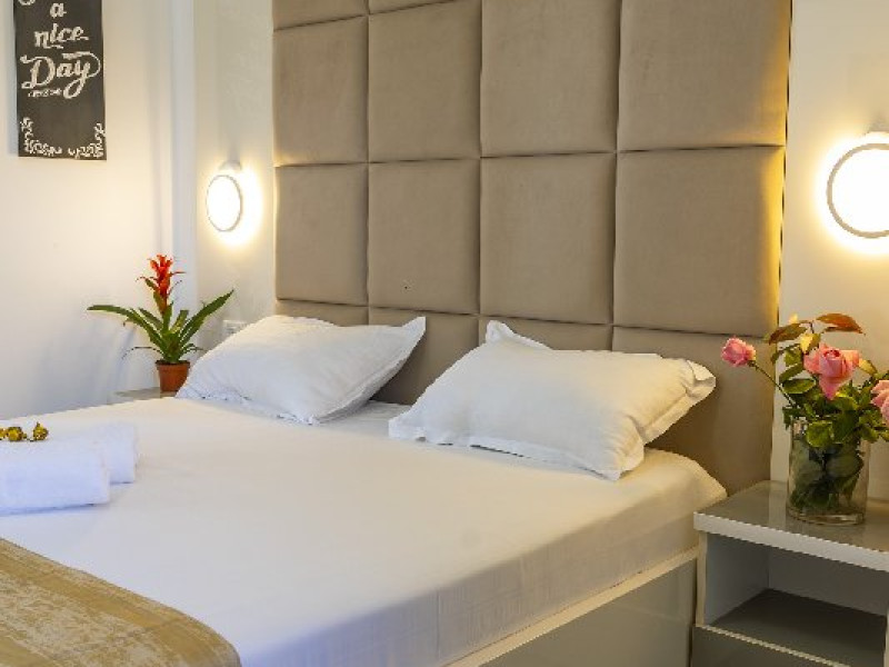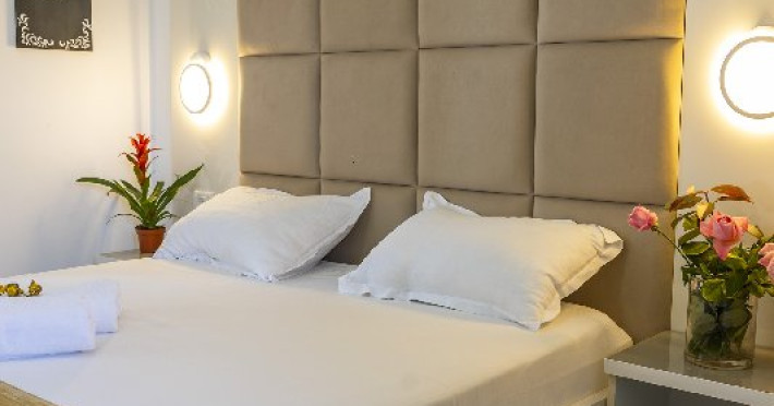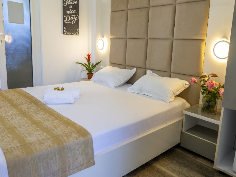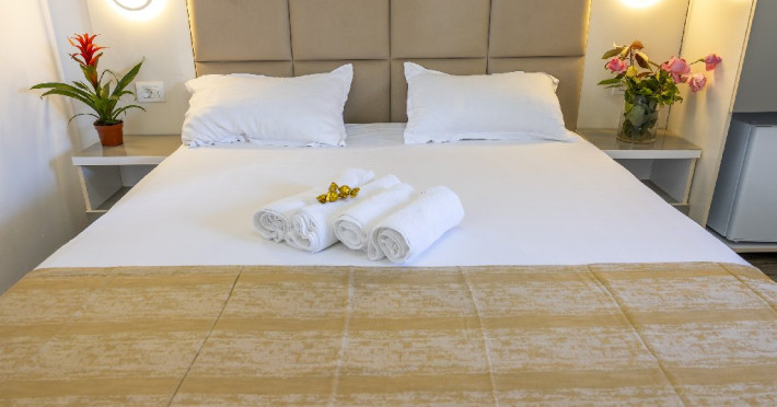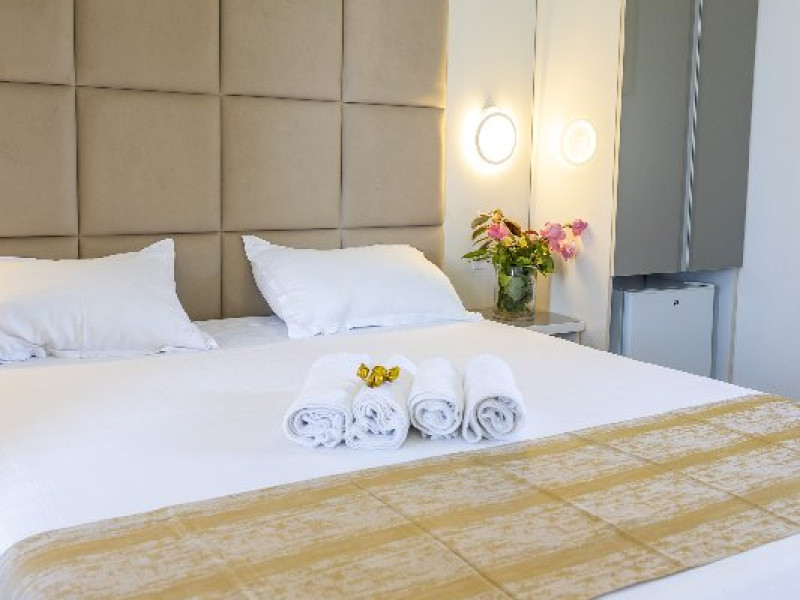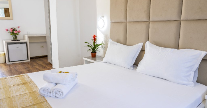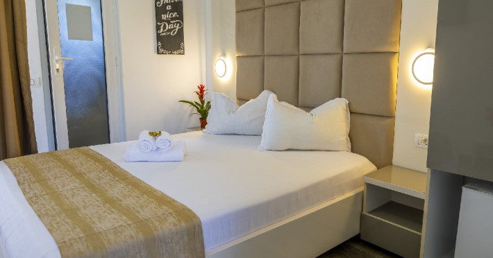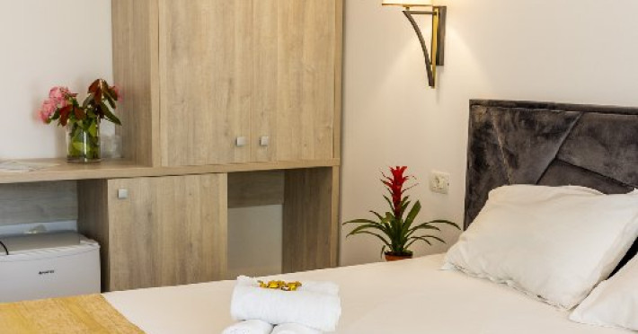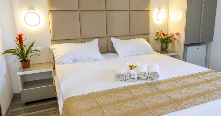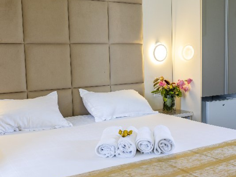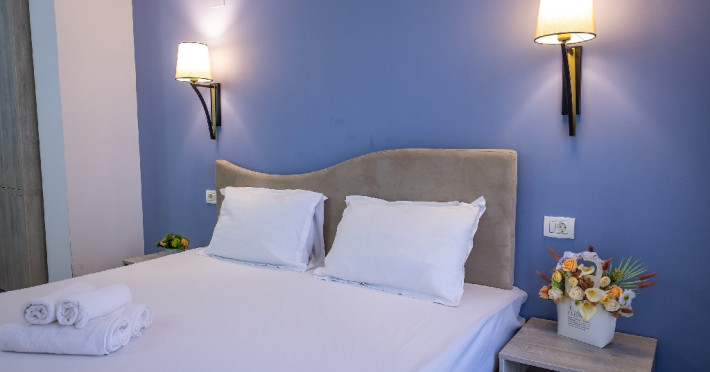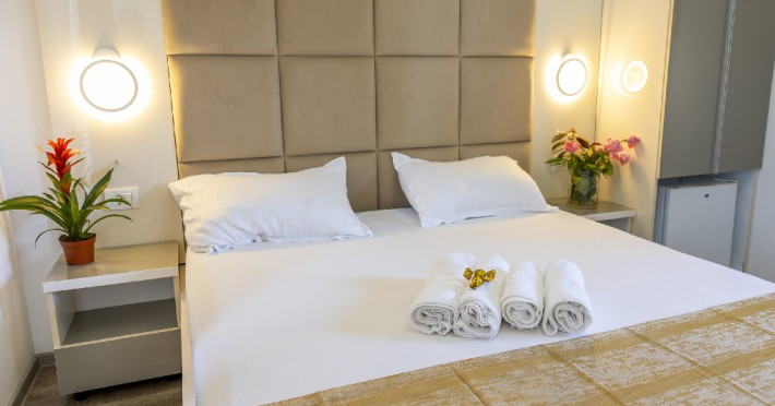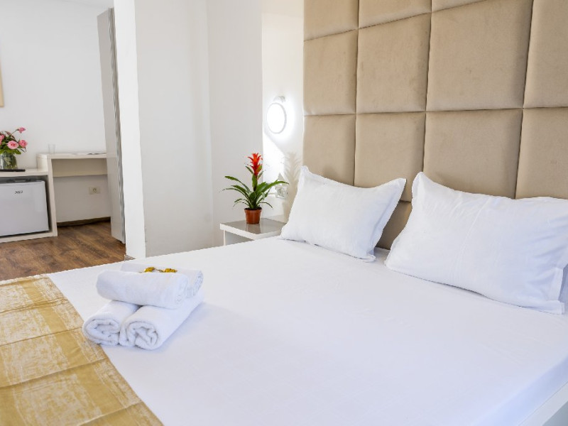 Camerele duble superioare, impartite in corpuri de cladiri cu regim de inaltime parter, au in dotare pat matrimonial si terasa privata.