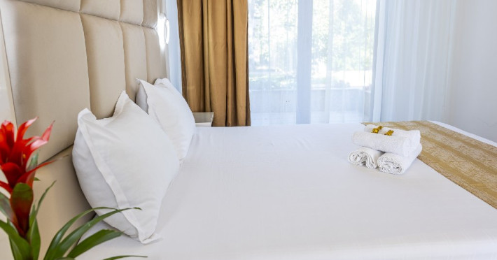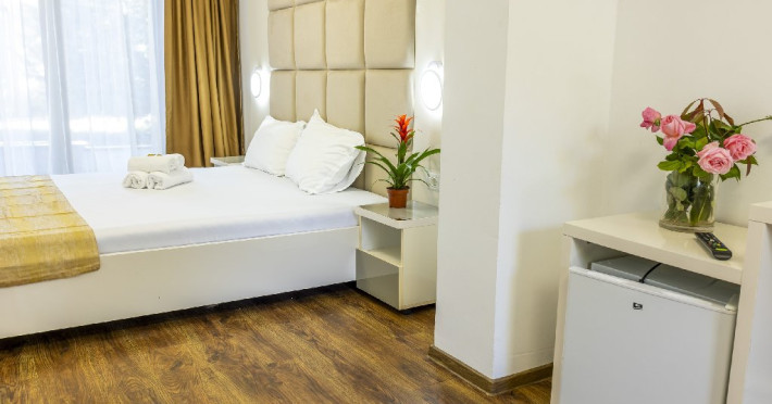Cazarea se face in 23 vile cu regim de inaltime: 6 cladiri P+2ET, 11 cladiri P+1ET si 6 cladiri Parter, vile renovate in mare parte in perioada 2022-2024, totalizand un numar de 305 camere duble si apartamente. Spatiile de cazare sunt dotate cu minibar, TV cu cablu, aer conditionat, balcon sau terasa si baie proprie, cu uscator de par la cerere in receptie.