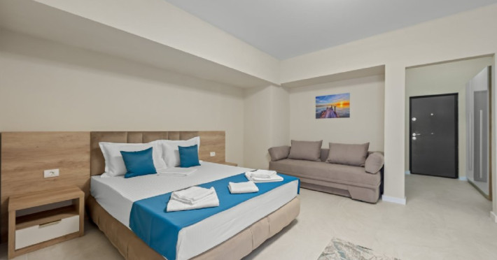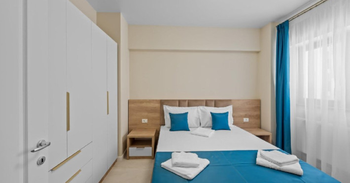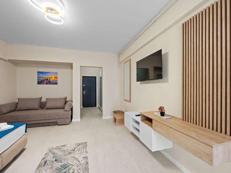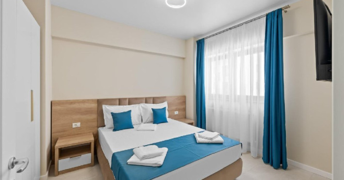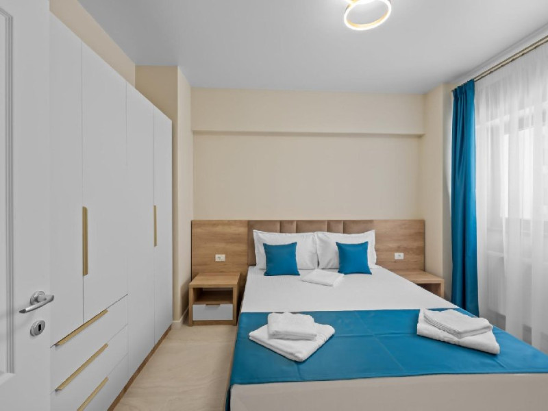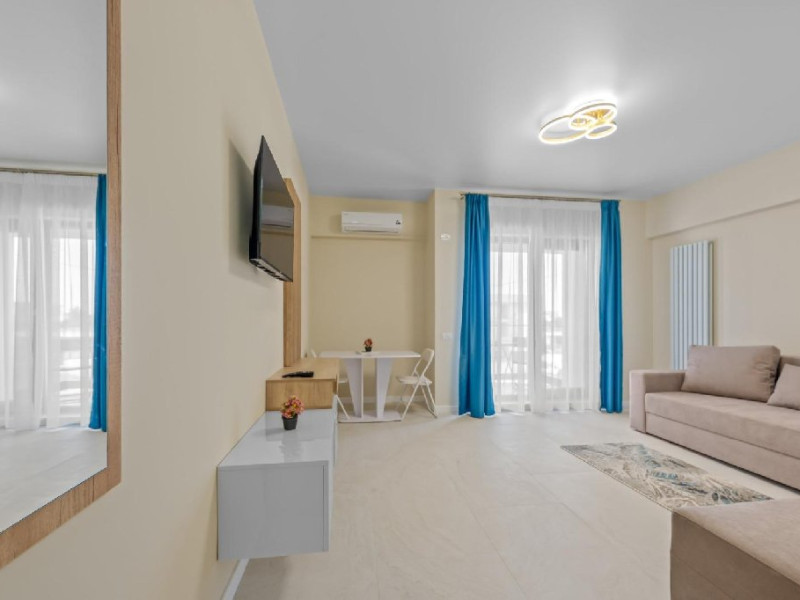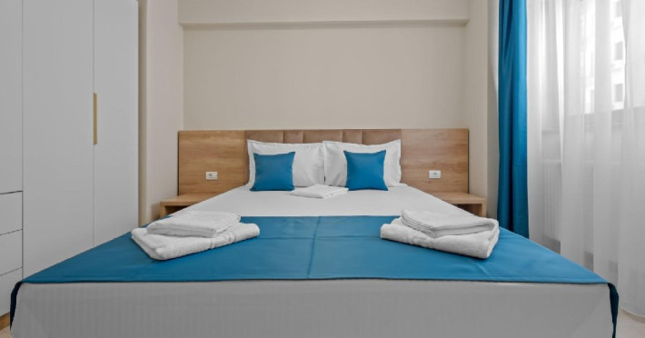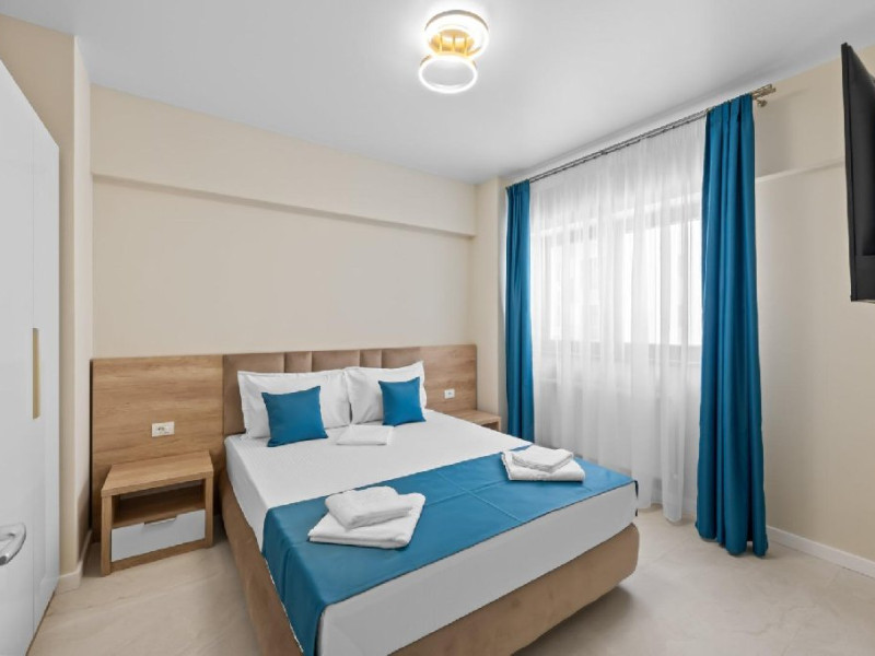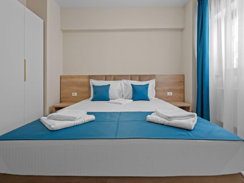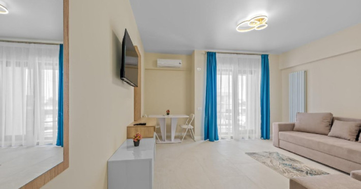 Dotari camere: Studiouri/Garsoniere de lux si apartamente, dotate cu aer conditionat, centrala gaze, canapea extensibila, TV Smart si router wifi in fiecare camera. Bucataria este complet utilata, cu zona de luat masa, frigider, cuptor cu microunde, plita pe gaze, cana electrica si vesela completa. Baie privata cu cabina de dus, uscator de par si articole de toaleta gratuite.