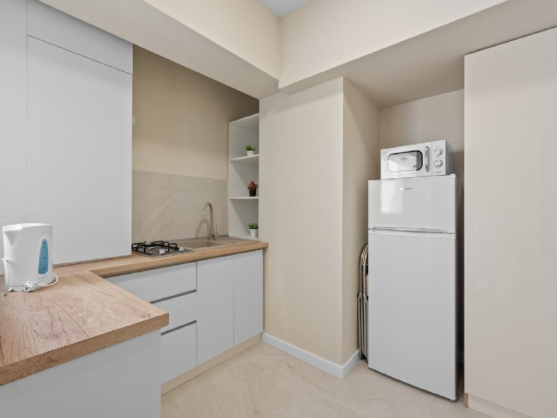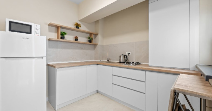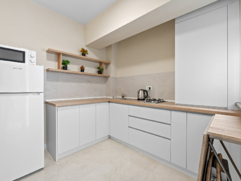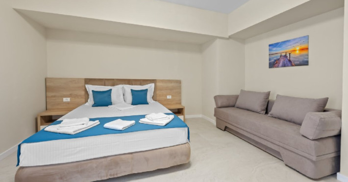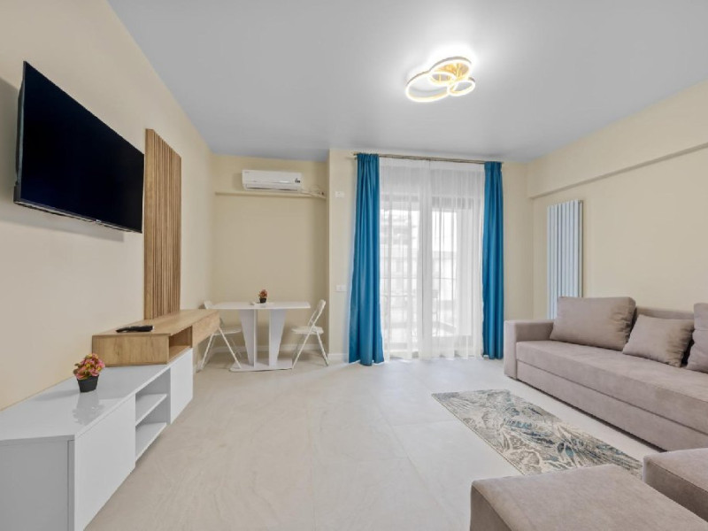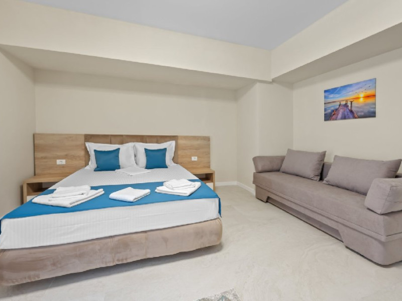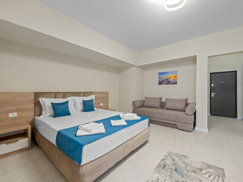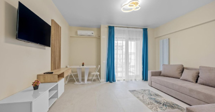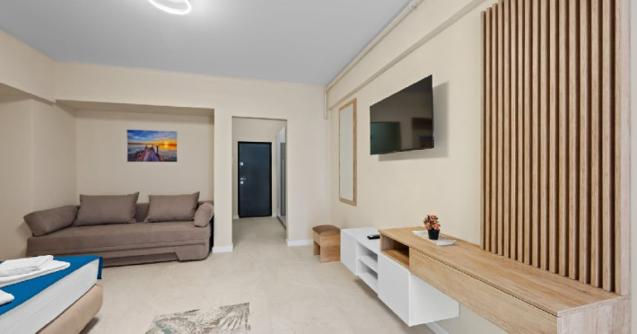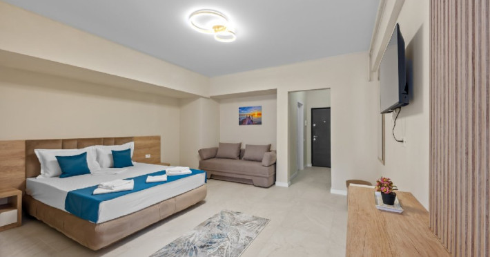 Dotari camere: Studiouri/Garsoniere de lux si apartamente, dotate cu aer conditionat, centrala gaze, canapea extensibila, TV Smart si router wifi in fiecare camera. Bucataria este complet utilata, cu zona de luat masa, frigider, cuptor cu microunde, plita pe gaze, cana electrica si vesela completa. Baie privata cu cabina de dus, uscator de par si articole de toaleta gratuite.