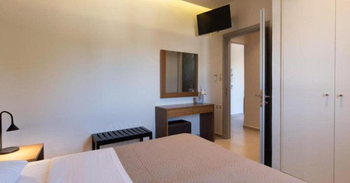 Camerele și apartamentele Dimitra, luminoase și spațioase, sunt dotate cu aer condiționat și se deschid spre un balcon cu vedere la mare sau la munte. Acestea sunt dotate cu TV prin satelit, mini-frigider și articole de toaletă gratuite. Unele unități au și o chicinetă, unde oaspeții iși pot pregăti propriile mese.