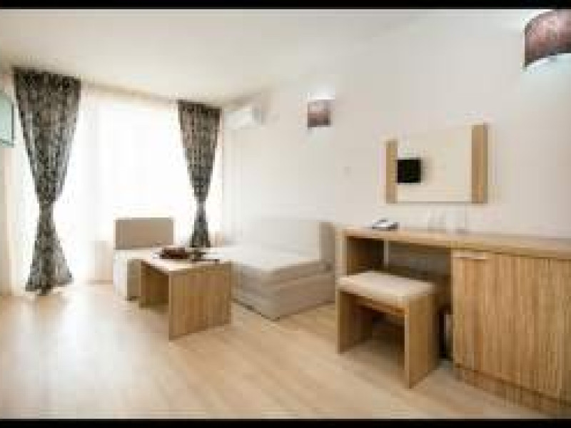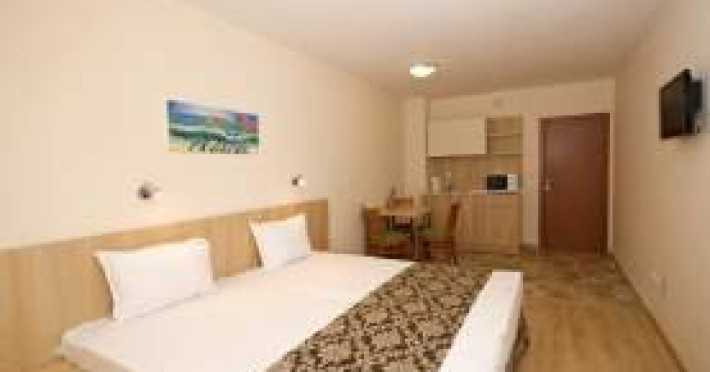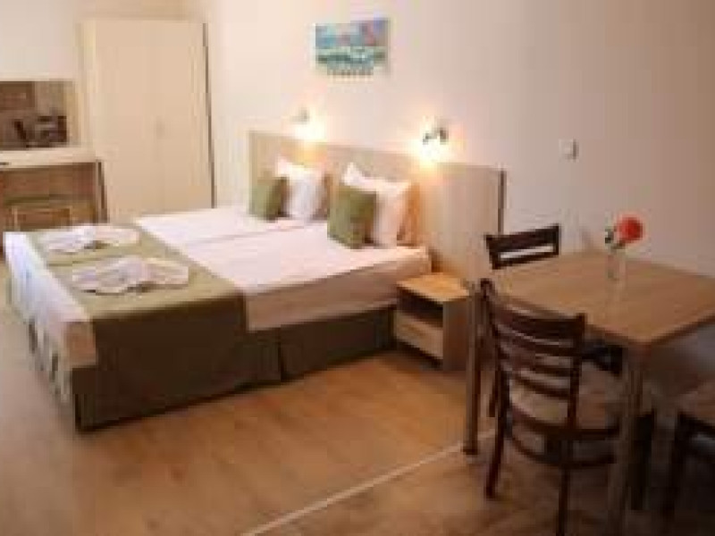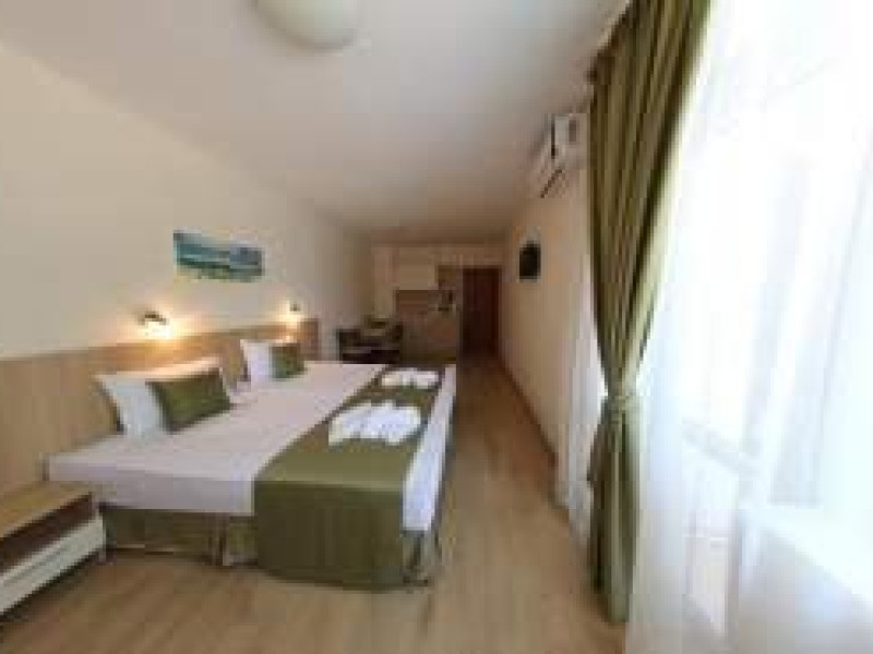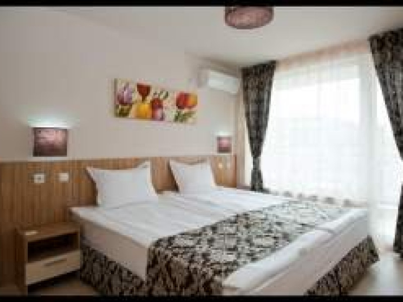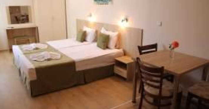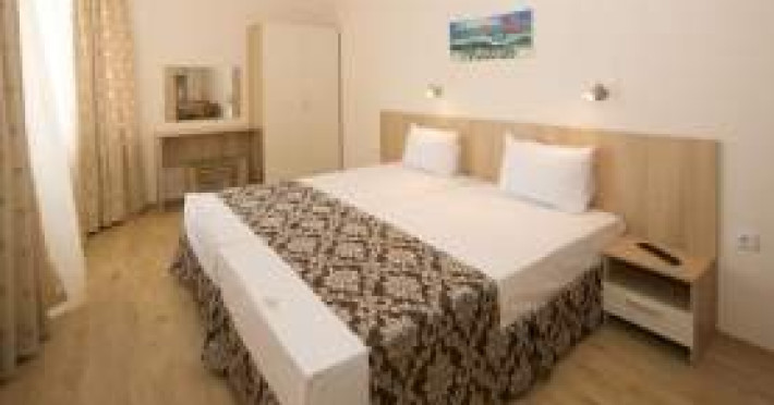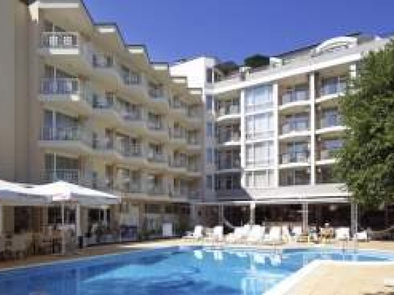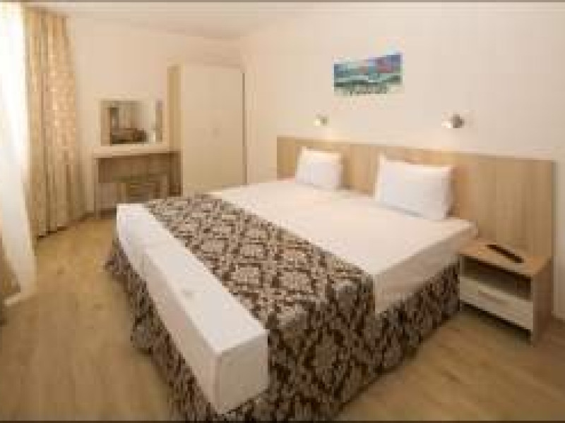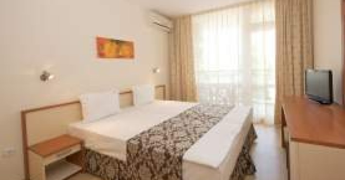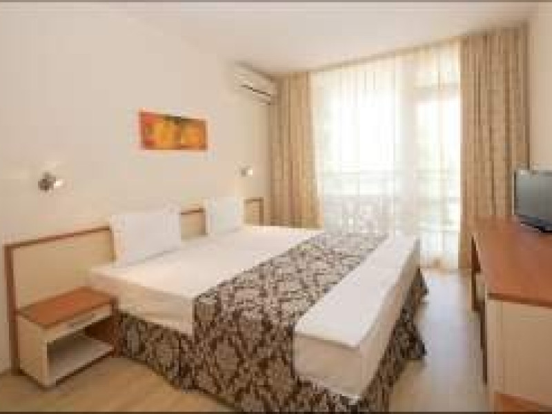 Localizare: este situat la 120 m de plaja, in a doua linie de hoteluri. Capacitate: o cladire de 5 etaje cu 40 camere duble, 4 apartamente 1 dormitor Facilitati hotel: piscina exterioara, aerobic (yoga, exercitii de respiratie), gimnastica acvatica, cabinet medical, masaj, restaurant, bar, seif la receptie (cca 2 eur / zi), lift, internet wireless, birou rent-a-car, biliard, jocuri mecanice, zona de parc si gradini, parcare. Camerele duble (25 mp): doua paturi, aer conditionat, frigider, TV, telefon, baie cu dus, uscator de par, stand uscator de rufe, balcon Apartament 1 dormitor (40mp): pat matrimonial in dormitor, canapea extensibila in living, usa intermediara intre dormitor si living, aer conditionat, frigider, masa de calcat, TV, telefon, baie cu cada, uscator de par, stand uscator de rufe, balcon, Accesul la piscina hotelului, sezlonguri si umbrelute la piscina, Wi-FI (in receptie si lobby bar). Nu este permis accesul cu animale de companie.